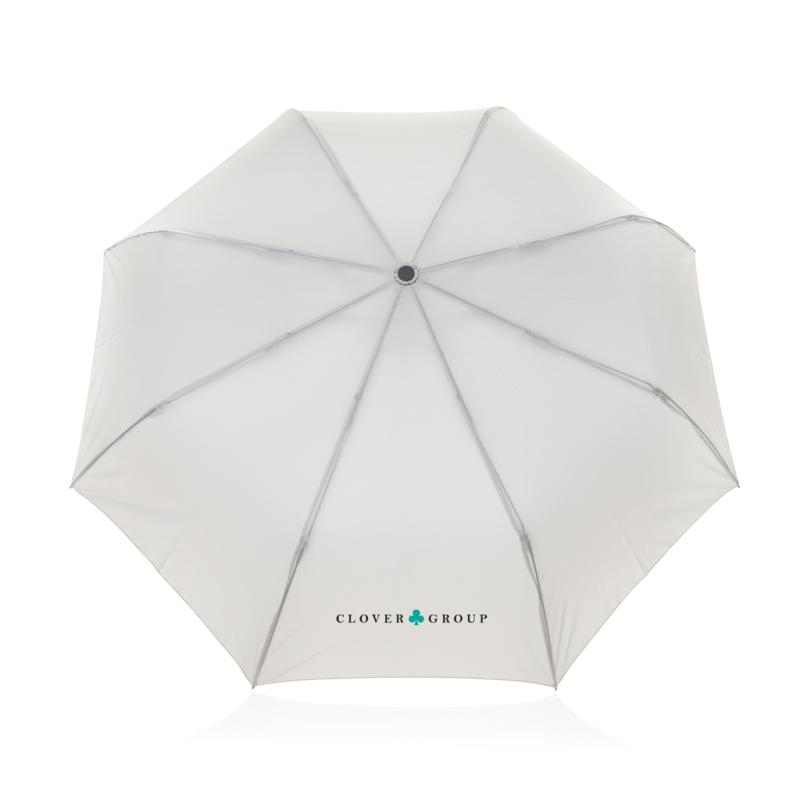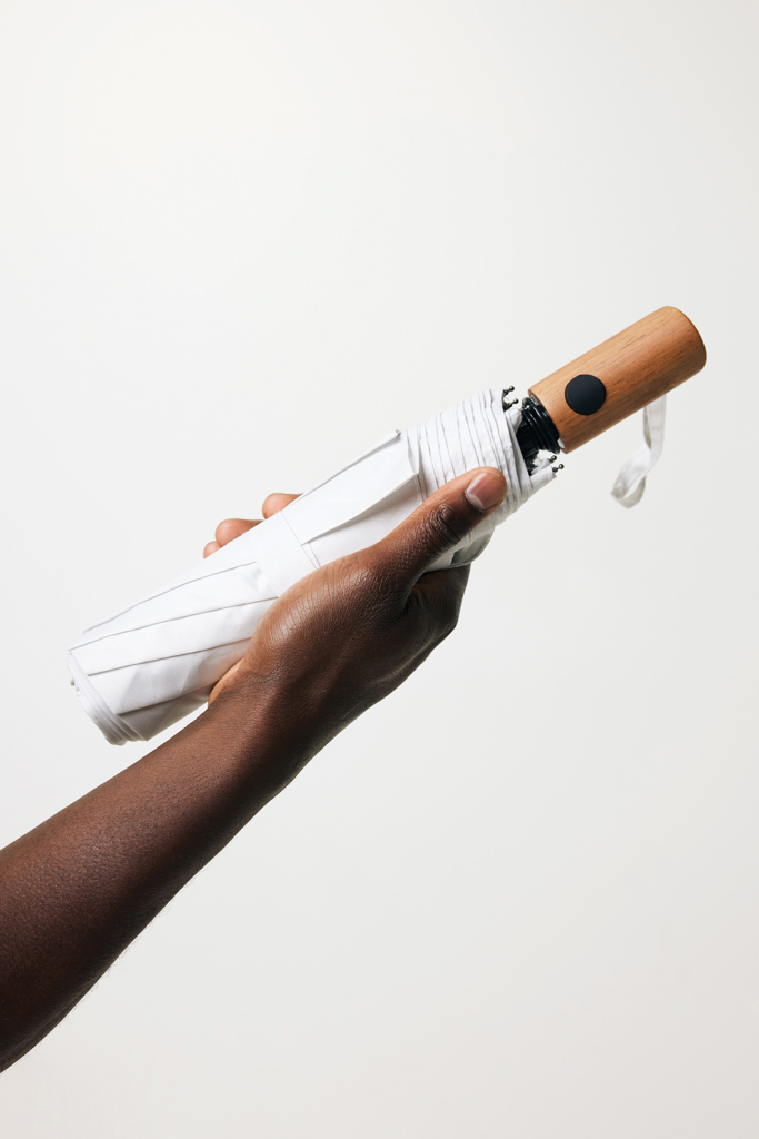 This compact 3-section auto-open mini umbrella is ideal for keeping in your bag or car for unexpected weather. Featuring a metal frame, fibreglass ribs and a beautiful FSC® certified acacia wooden handle. The canopy is made of recycled polyester which includes an AWARE™ tracer for genuine recycled materials. 2% of proceeds of each Aware™ product sold will be donated to Water.org. Please note that the acacia wooden handle might have some differences in colour and texture. This does not compromise its functionality or durability.