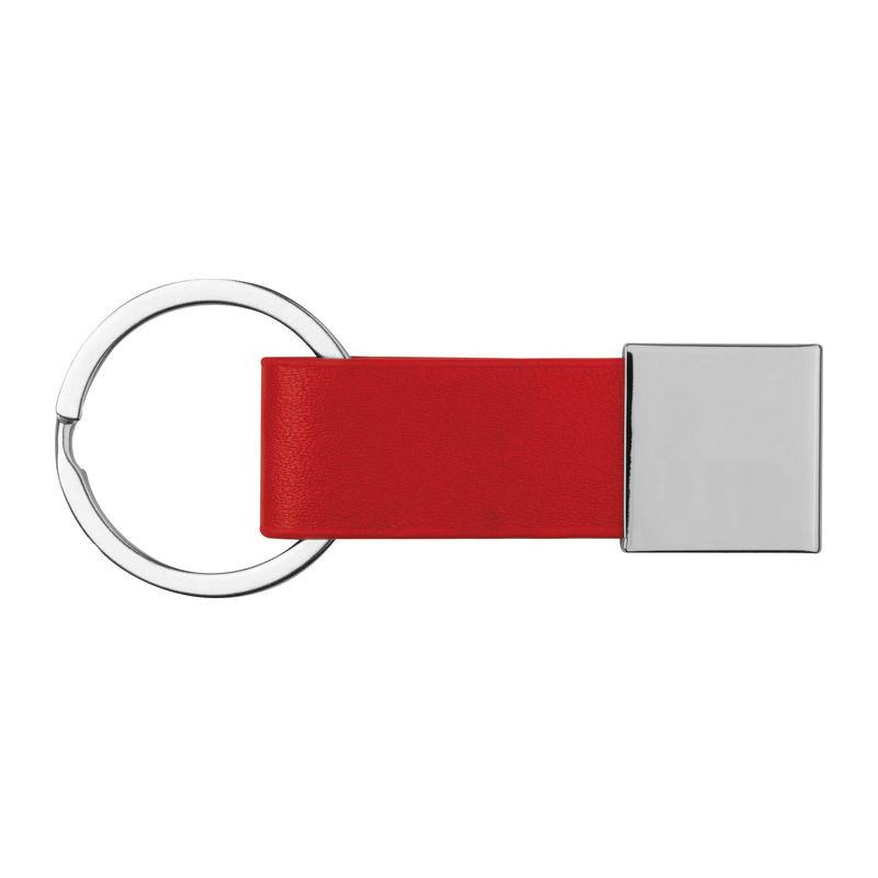 Keychain with coloured leatherette and shiny metal plate for laser engraving.