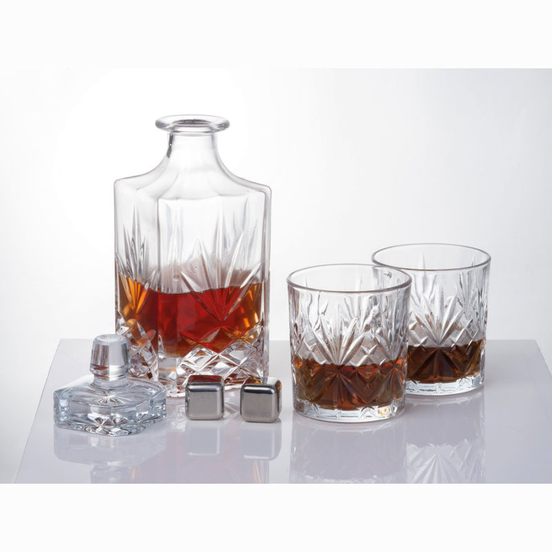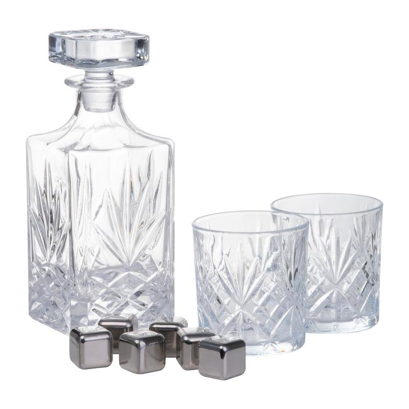 High-quality whiskey set with decanter (800 ml) and two borosilicate glasses (250 ml), including 6 stainless steel ice cubes in a bamboo box.