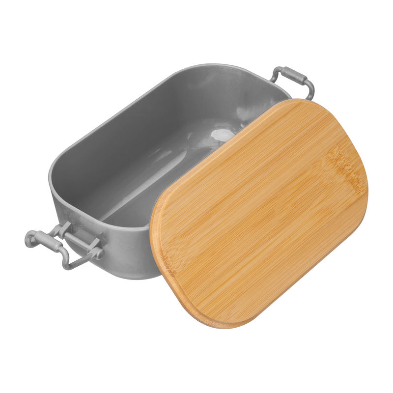 Lunchbox with bamboo lid and clamp closure keeps meals securely sealed. With a capacity of 750 ml, it offers plenty of space for various meals. Your advertisement will be engraved on the bamboo lid.
