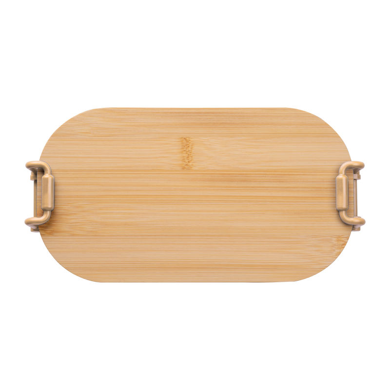 Lunchbox with bamboo lid and clamp closure keeps meals securely sealed. With a capacity of 750 ml, it offers plenty of space for various meals. Your advertisement will be engraved on the bamboo lid.