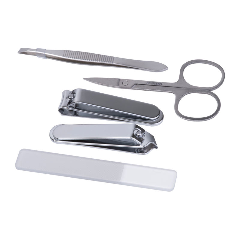 Compact 5-piece manicure set in a metal case with stainless steel tools: 1 pc nail file, 1 pc tweezers, 1 pc scissor and 2 pcs clippers.