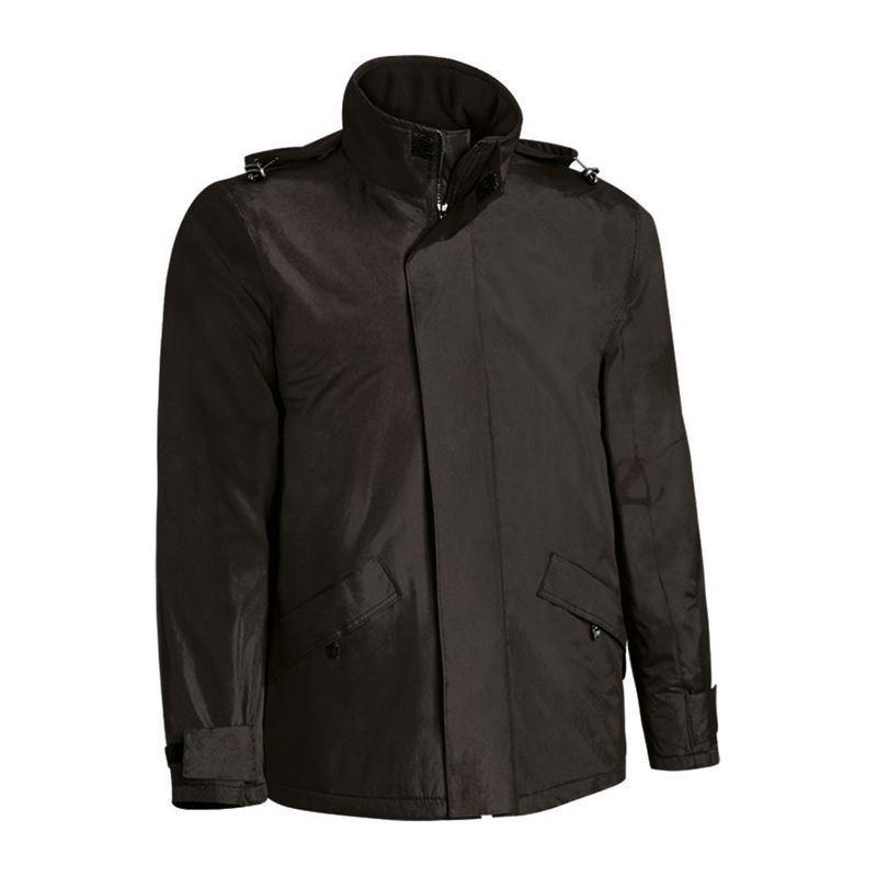 Outside fabric 100% Polyester unisex winter jacket. Padded 100% Polyester 250 grs/m². Double layered fabric, waterproof on the outside, inside padded. Hood hidden in neck band. 2 zip front pockets. 1 pocket in the inside (left side) with Velcro. 10 units per box. Individual bag.