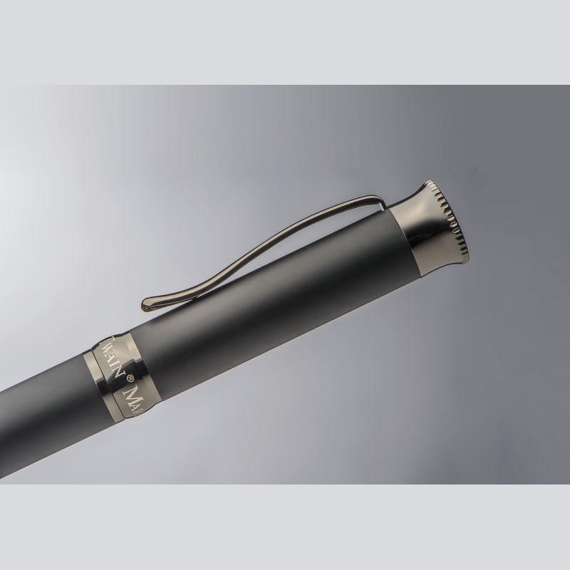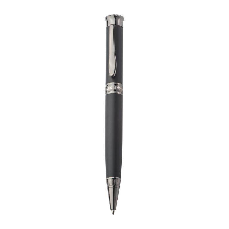 Mark Twain metal ballpen with dark chromed applications and large blue-writing refill. Delivered in a noble case. We will engrave your logo to the right of the clip.