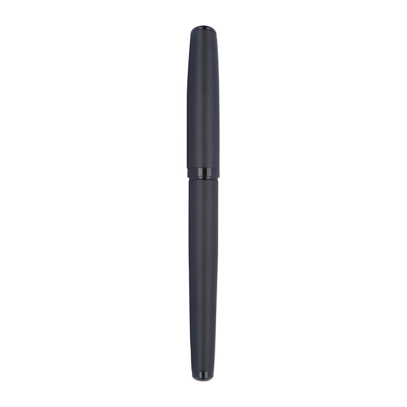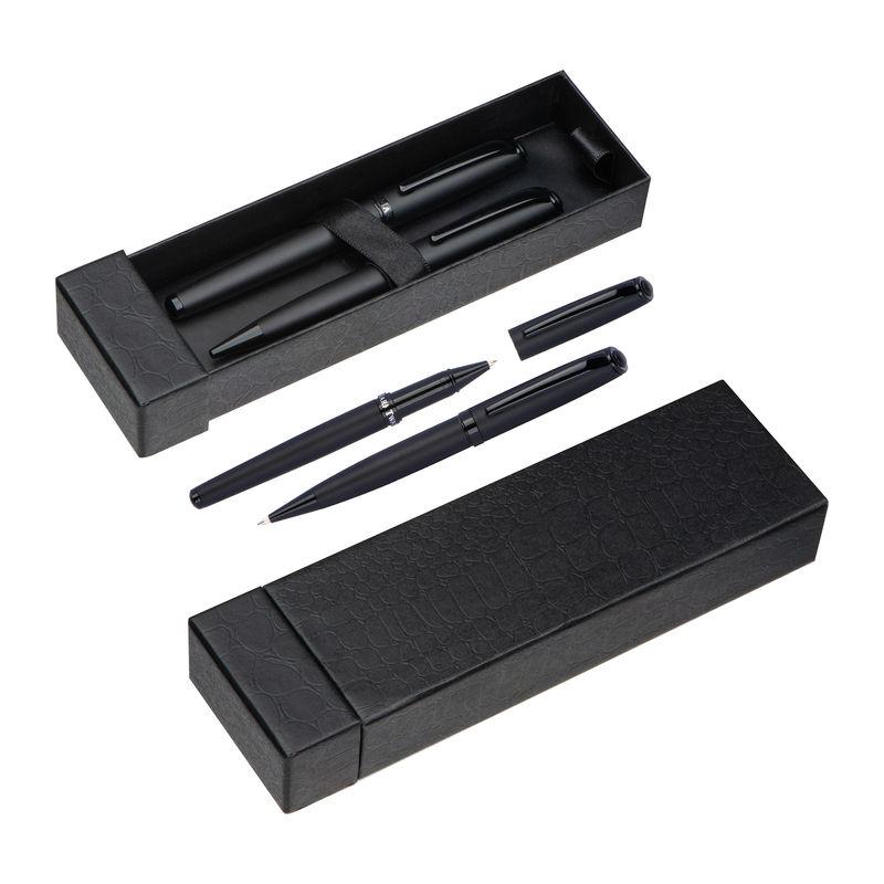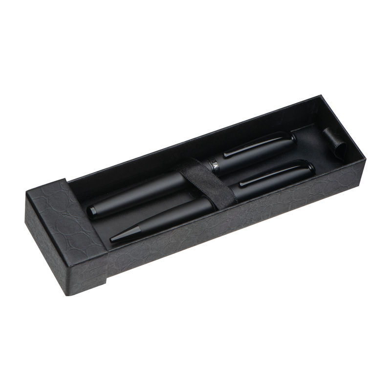 Mark Twain writing set consisting of a twist pen and a rollerball made of metal with a black, matt barrel and shiny black applications, packed in a gift box. Your logo will be engraved on both writing instruments.
