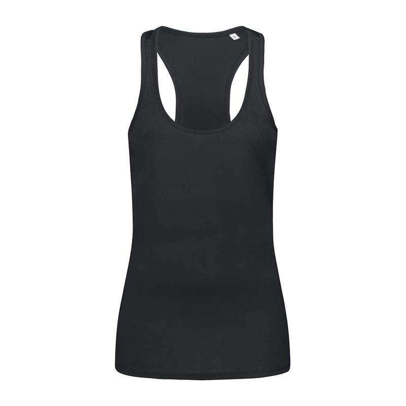Modern and stretchy sports top with racerback for women made of quick-drying, breathable mesh-material with decorative flatlock seams and excellent freedom of movement.