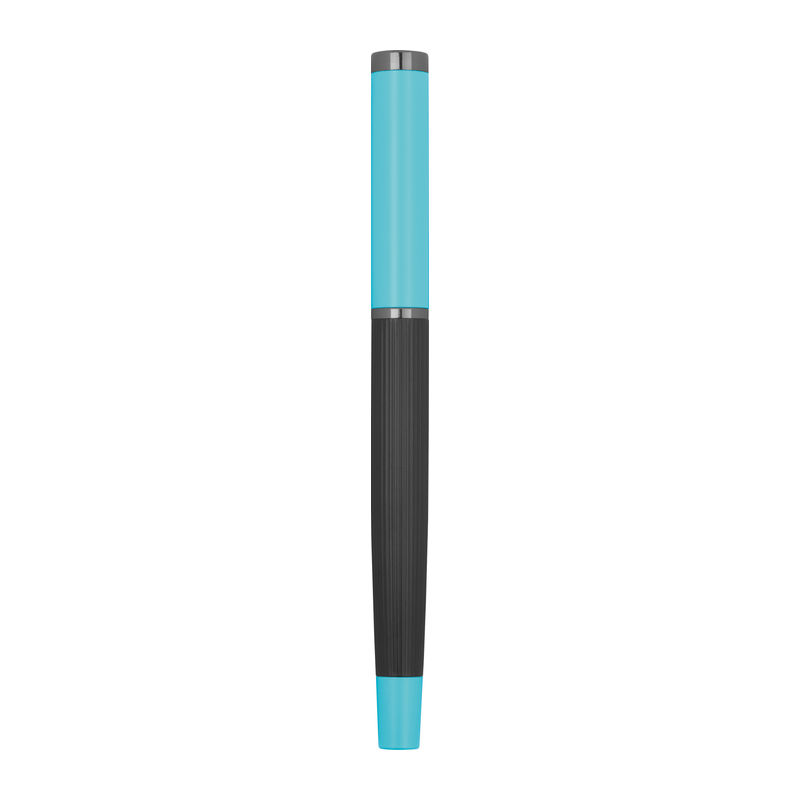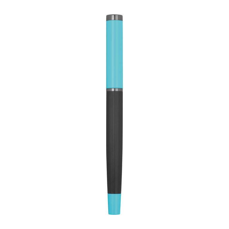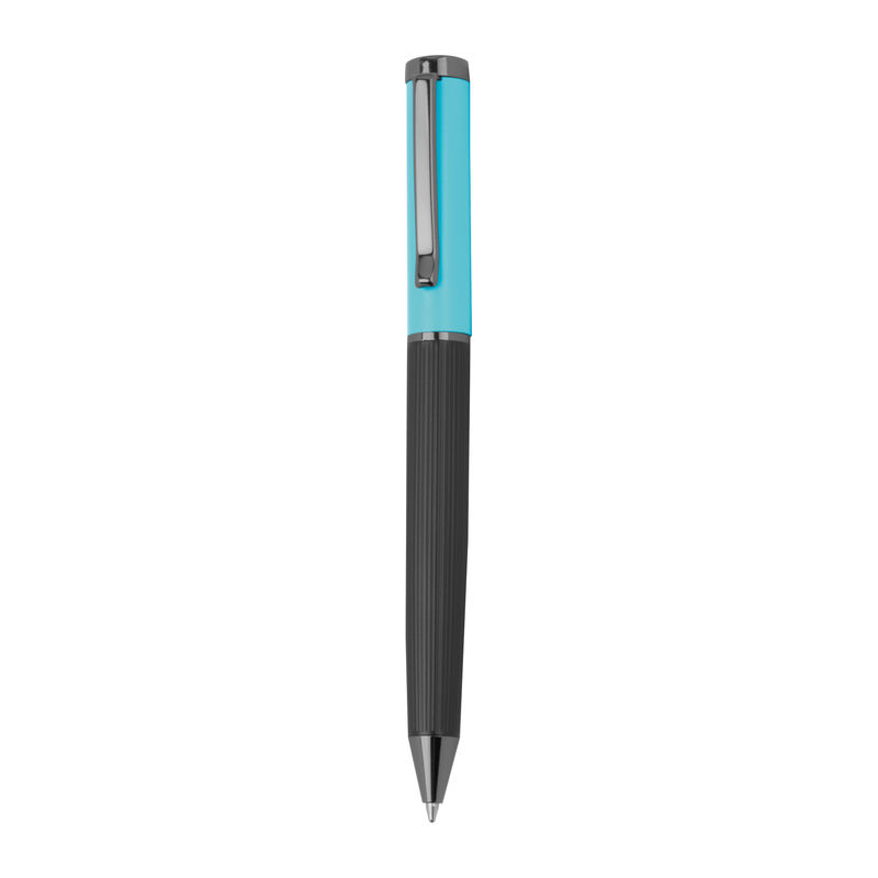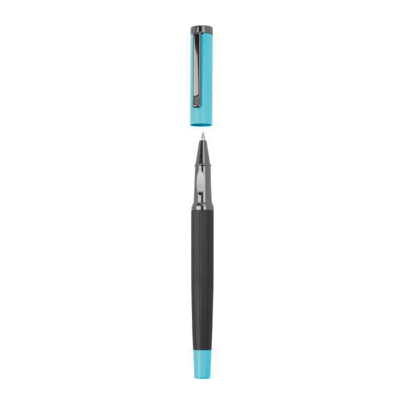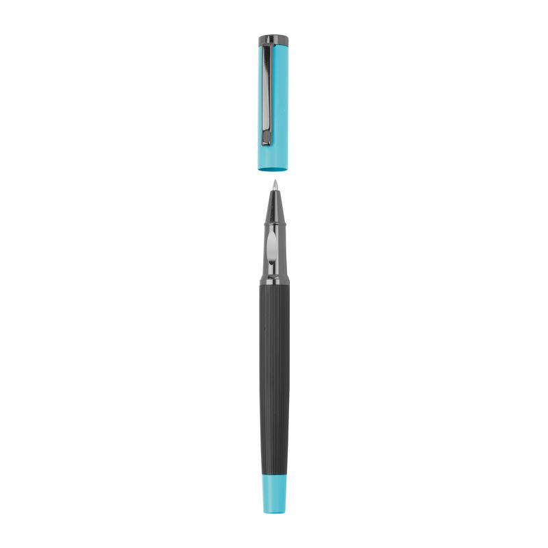 Blue-writing metal writing set consisting of a ballpoint pen (800 m writing length) and a rollerball pen (500 m writing length) in a color-coordinated folding box.
