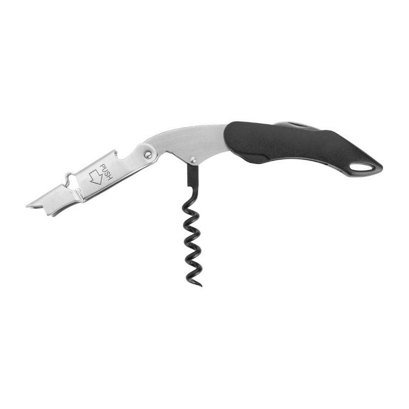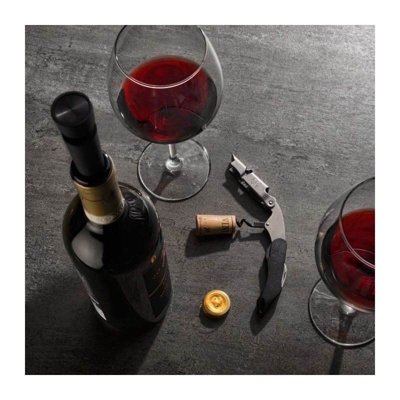 This wine set includes a two-lever metal corkscrew with a plastic grip and a plastic vacuum stopper. The corkscrew also includes a knife for cutting the wine wrapper. The stopper is suitable for standard bottles. Packed in a Vanilla Season gift box.