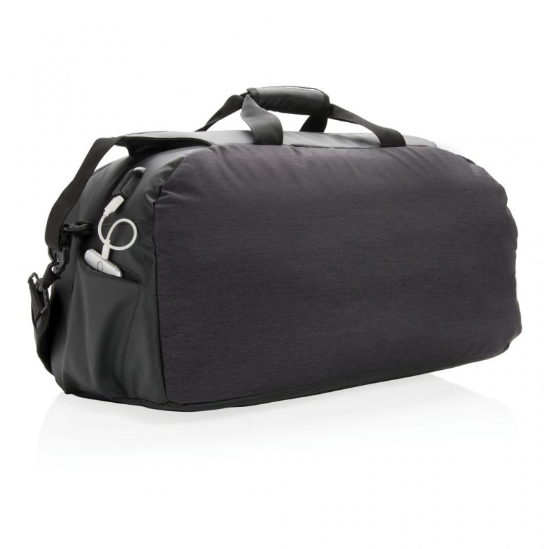 Unique designed weekend bag with one large main compartment and one front compartment. Connect your powerbank easily to the integrated USB charging port and charge your phone or tablet on the go. With phone or water bottle pocket on side. With convenient card holder in shoulder strap.