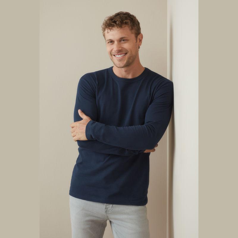 Fitted long sleeve T-shirt for men features collar with rib binding and made of durable single jersey cotton.
