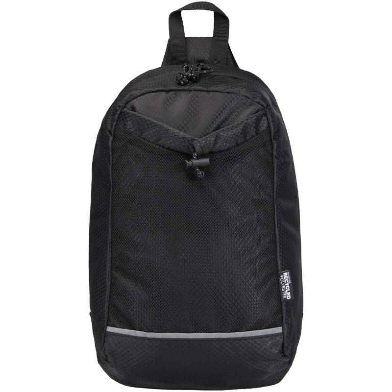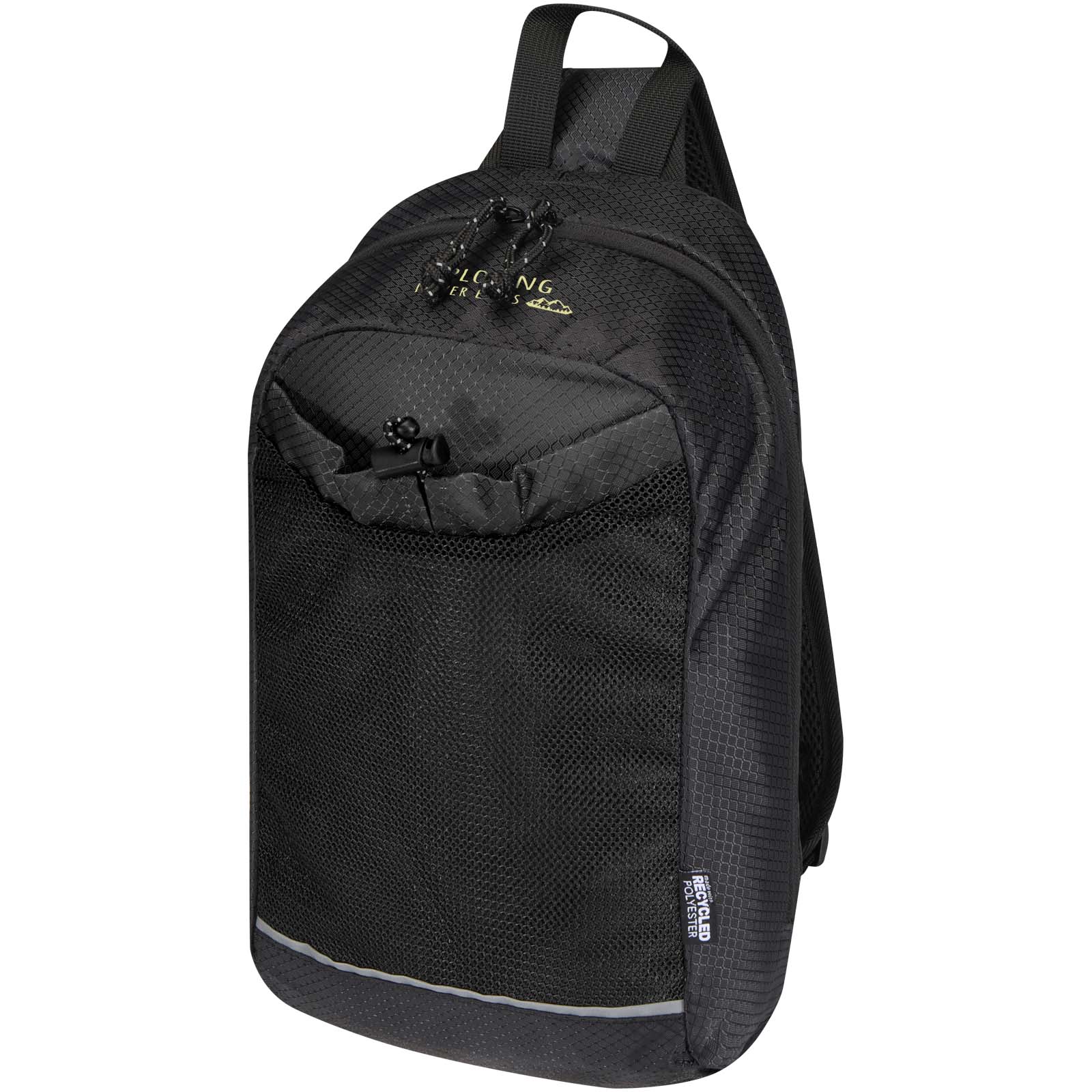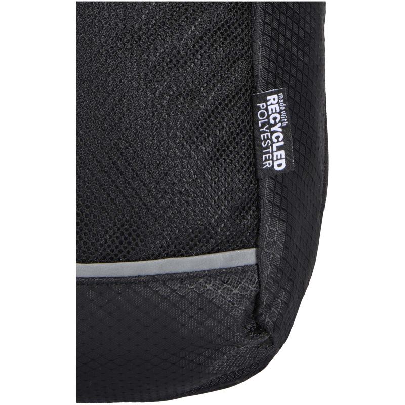 The Nomad hydration crossbody bag is made from GRS certified recycled ripstop fabric with a water-repellent finish, GRS certified RPET lining, and reflective elements. It is designed for fast hikes, trail runs, festivals, or any activity where you need to carry water and essential items without extra bulk. The bag includes a zipped main compartment with an inner sleeve pocket, a mesh front pocket with an elastic drawstring to hold a water bottle securely, and a large quick-access pocket on the back for your phone or other small items. The adjustable strap and breathable mesh back provide carrying comfort. Volume capacity: 6 litres.