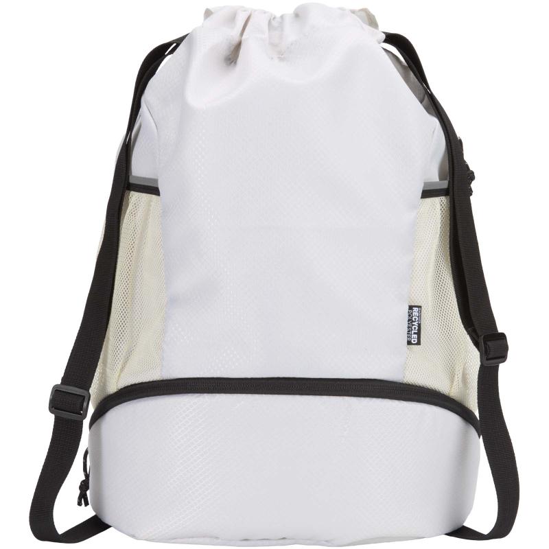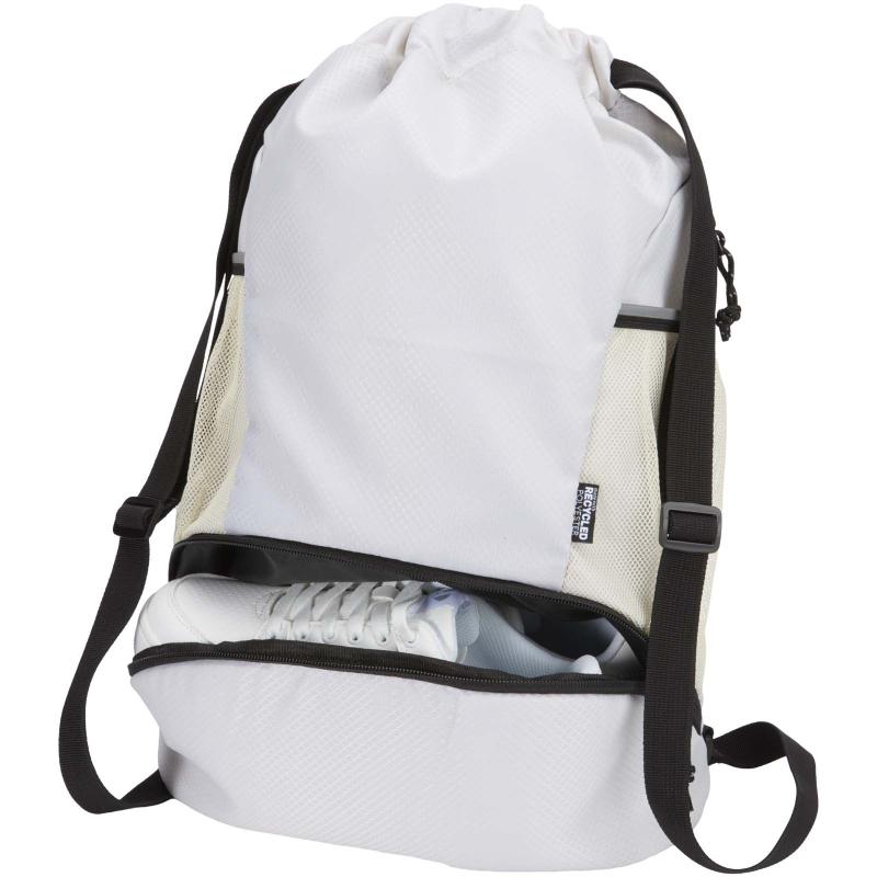 The Nomad sports drawstring bag is made from GRS certified recycled ripstop fabric with a water-repellent finish, GRS certified RPET lining, and reflective elements. It is designed for people with an active lifestyle and is suitable for daily exercise and sports activities. The bag has a spacious main compartment that can hold clothing, a towel, or even a basketball. A separate bottom compartment keeps shoes or used clothes apart from other items. It also includes two side mesh pockets with reflective details, one hidden zipped pocket for valuables, and adjustable webbing shoulder straps for comfortable carrying.