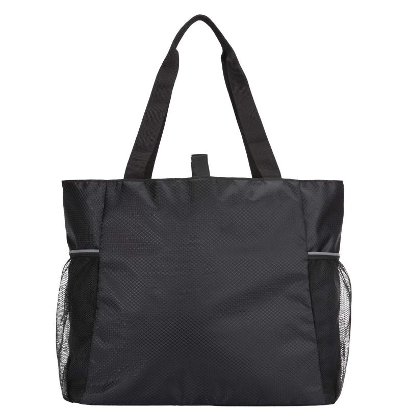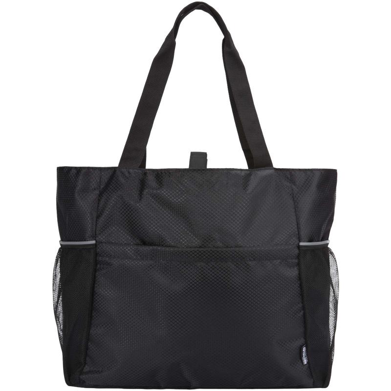 The Nomad yoga tote bag is made from GRS certified recycled ripstop fabric with a water-repellent finish, GRS certified RPET lining, and reflective elements. It is designed to help you stay organised during studio sessions, beach visits, or everyday errands. The bag features a spacious zipped main compartment and multiple organisational pockets inside and outside. Elastic webbing straps with hook and loop closure on top allow you to carry a yoga mat or beach mat securely. The tote bag has space for your mat, towel, water bottle, a change of clothes, and personal items, making it suitable for both exercise and daily activities.