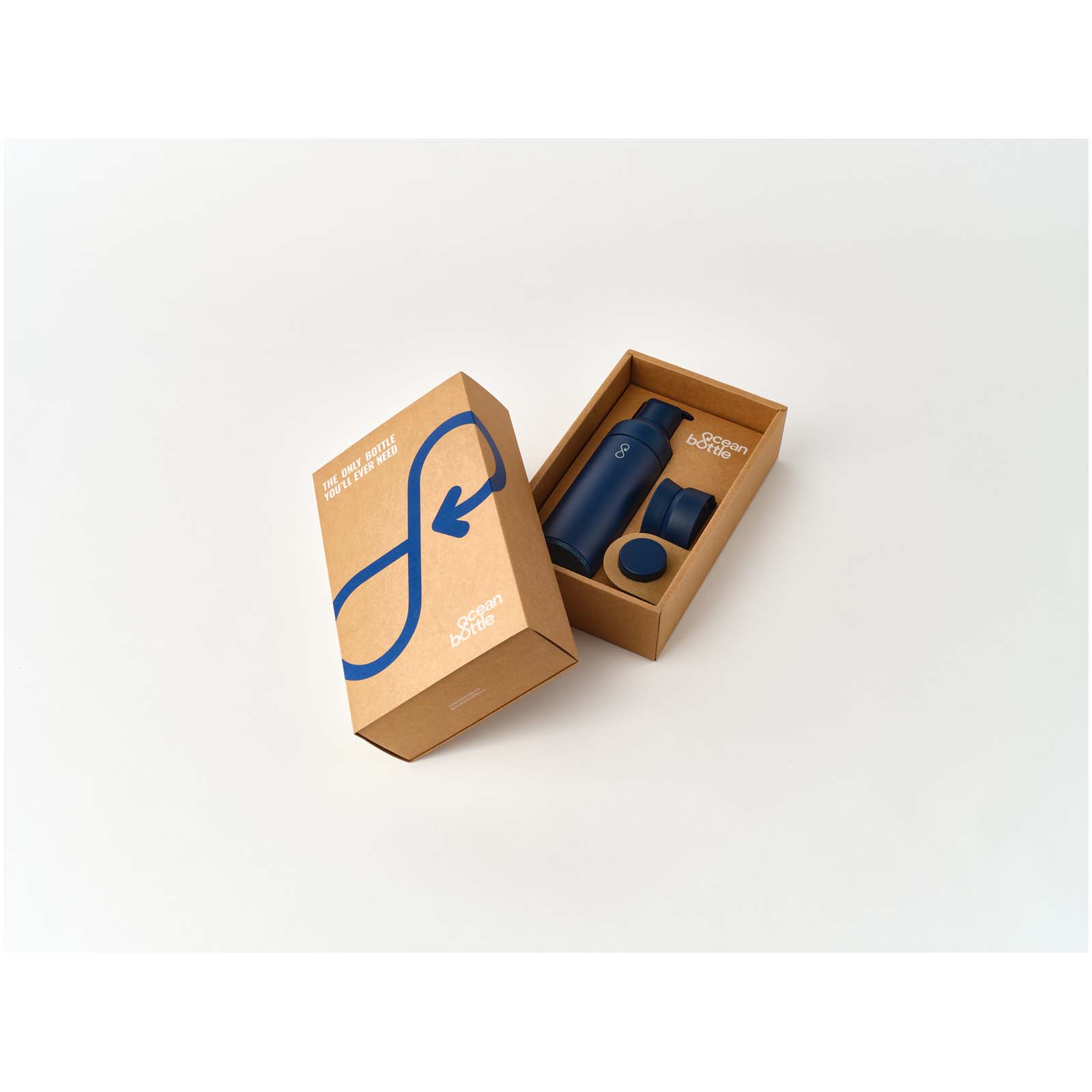 The 500 ml Ocean Bottle gift set features a first-of-its-kind modular lid system enabling seamless transitions from one activity to another with its 3 interchangeable lids. This gift set consists of an Ocean Bottle 500 ml bottle with 3 lids: The original lid (for everyday leak-proof sipping), the GO lid (with a lockable straw lid), and the brew lid (for enjoying hot drinks on the move). Designed with a dual opening function this modular bottle provides easy access for filling, cleaning and adding ice. The gift set is made from recycled materials and is dishwasher safe. Presented in a responsibly sourced recycled cardboard gift box.