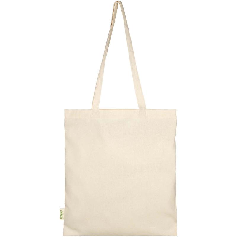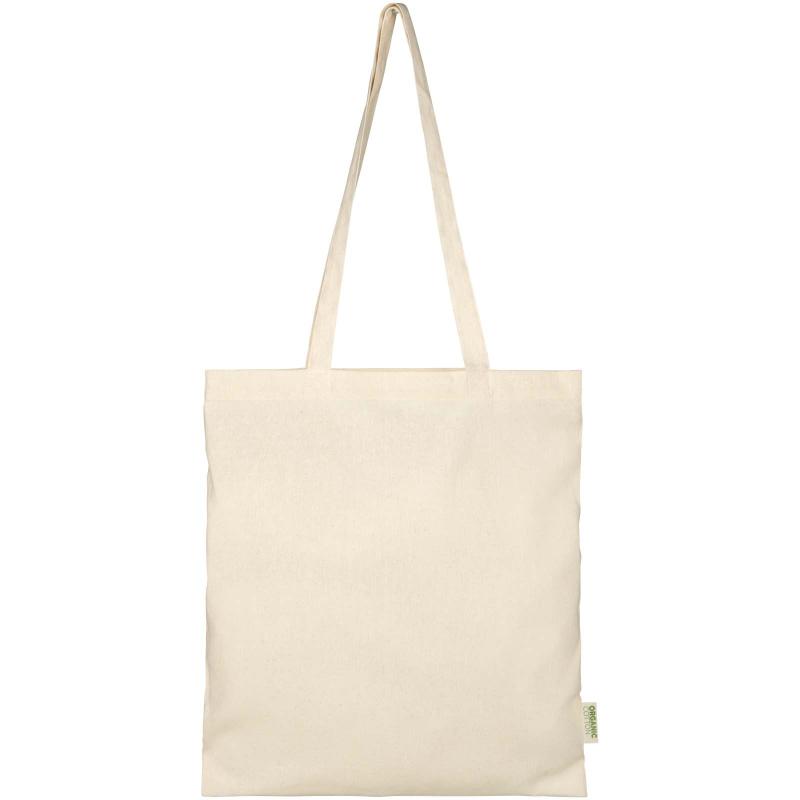 Tote bag made from 100% OCS certified 100 g/m² organic cotton originating from India, featuring a large open main compartment providing plenty of space to carry around all of the essentials. The 32 cm long handles makes it comfortable and easy to carry around wherever you go. Resistance up to 5 kg weight. Volume capacity: 7 litres.