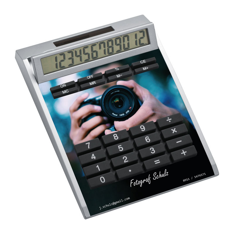 CrisMa design desk calculator with 12 digits and solar power made of silver plastic. Unique, thanks to the digital printing possibilities -create your calculator just as you like.