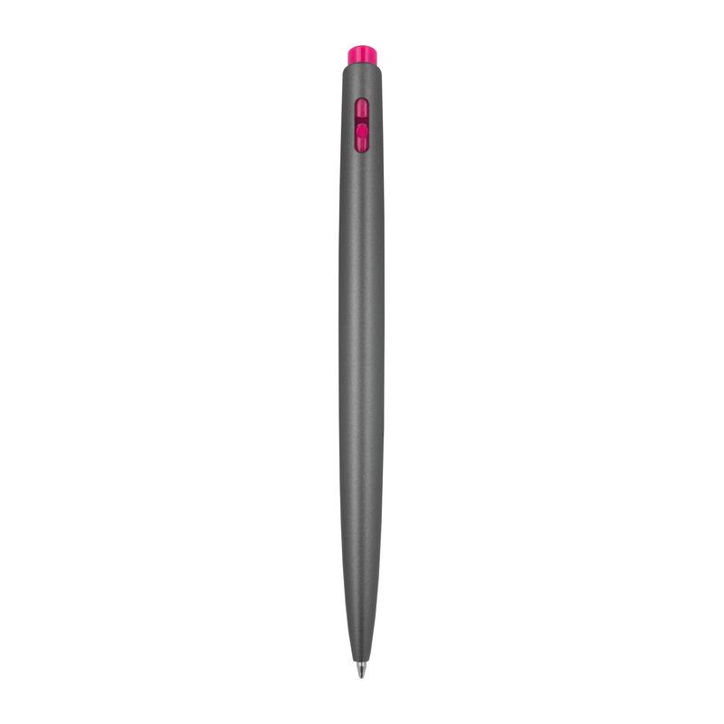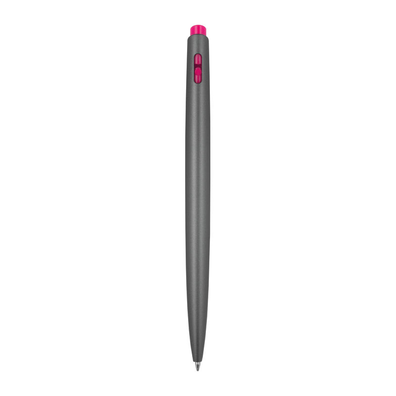 Retractable biros made of recycled plastic with coloured applications and large capacity refill that writes in blue. Your logo is printed to the right of the clip.
