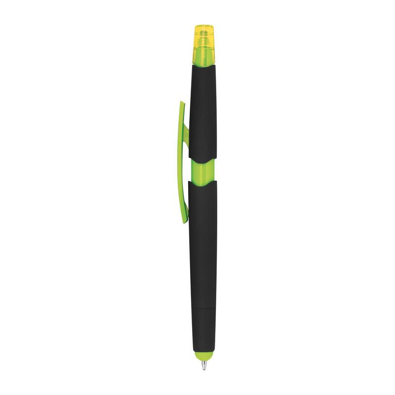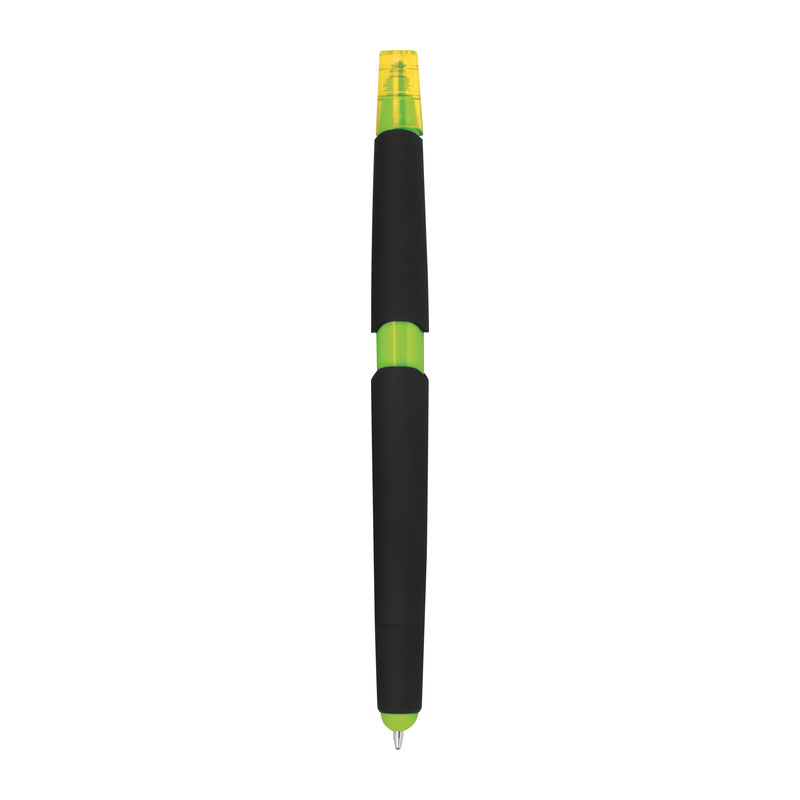 Plastic ballpoint pen with highlighter, rubberized sheath, blue-writing refill, and touch function. We will print your logo to the right of the clip.