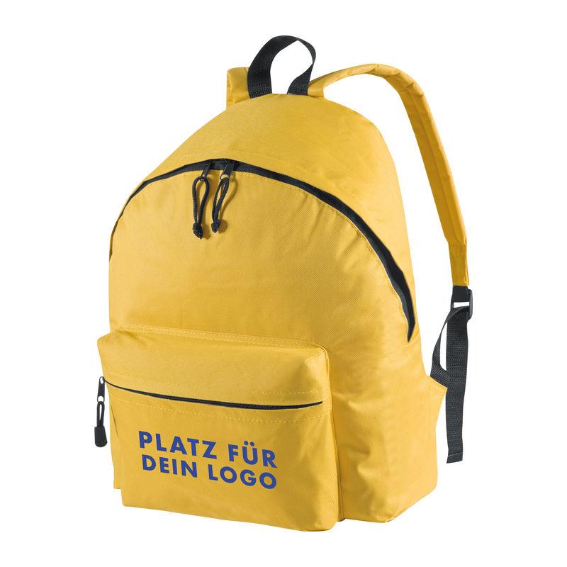 600D polyester backpack with hanger loop, two side pockets, output for headphones, two padded shoulder straps and a filling capacity of 13 liters. We will print your logo on the front.