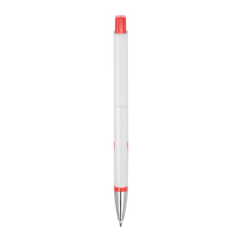 White ballpoint pen made from recycled plastic (RABS) with blue ink refill.