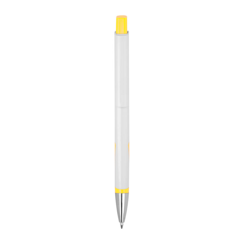 White ballpoint pen made from recycled plastic (RABS) with blue ink refill.