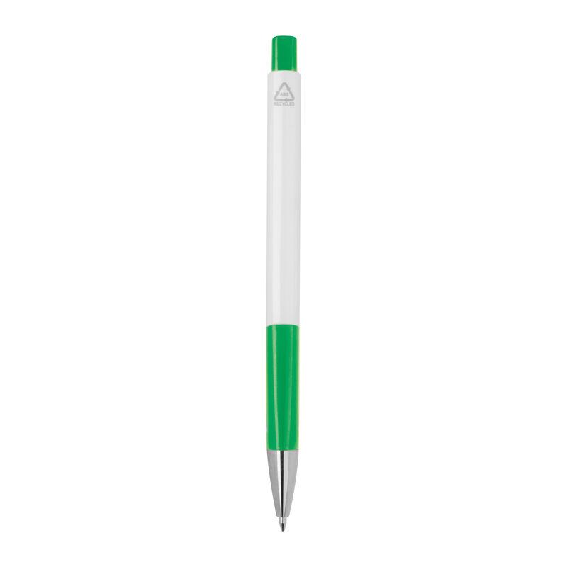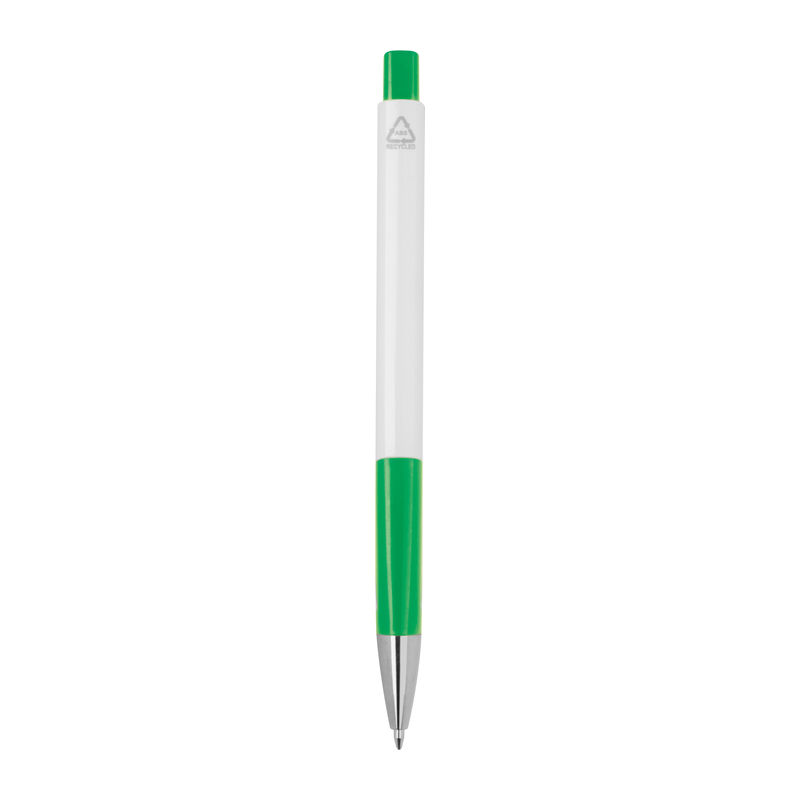 White ballpoint pen made from recycled plastic (RABS) with blue ink refill.