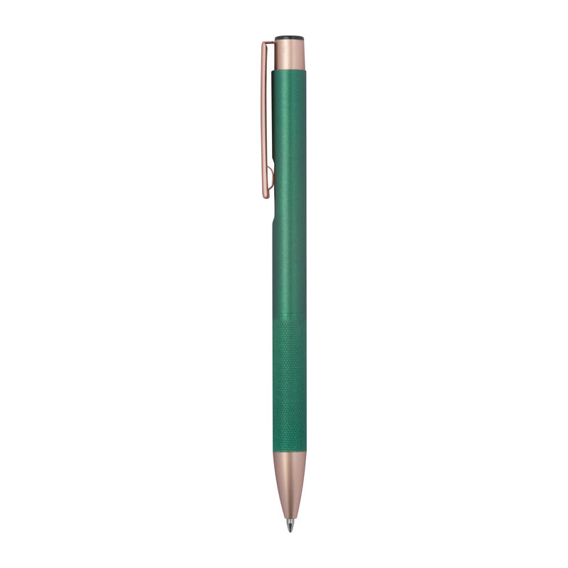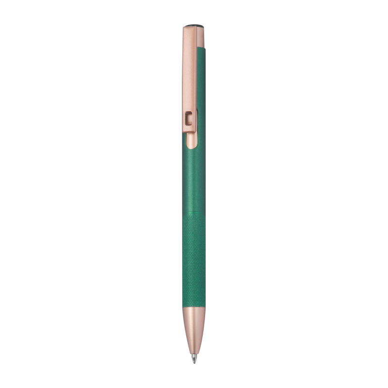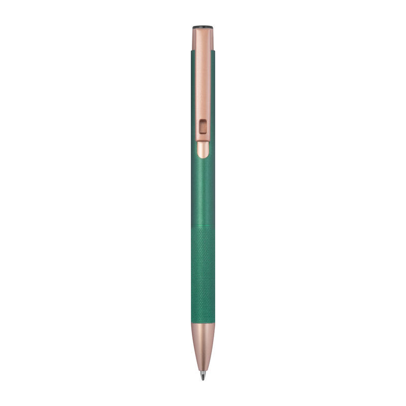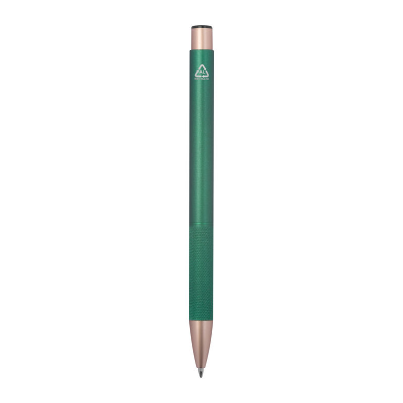 Ballpoint pen made of recycled aluminum with a matte finish and rose gold accents, equipped with a blue-writing large-capacity refill and a diamond-patterned grip zone. Your logo will be engraved to the right of the clip.