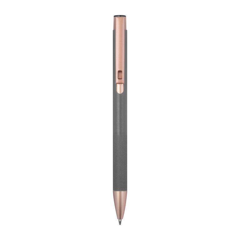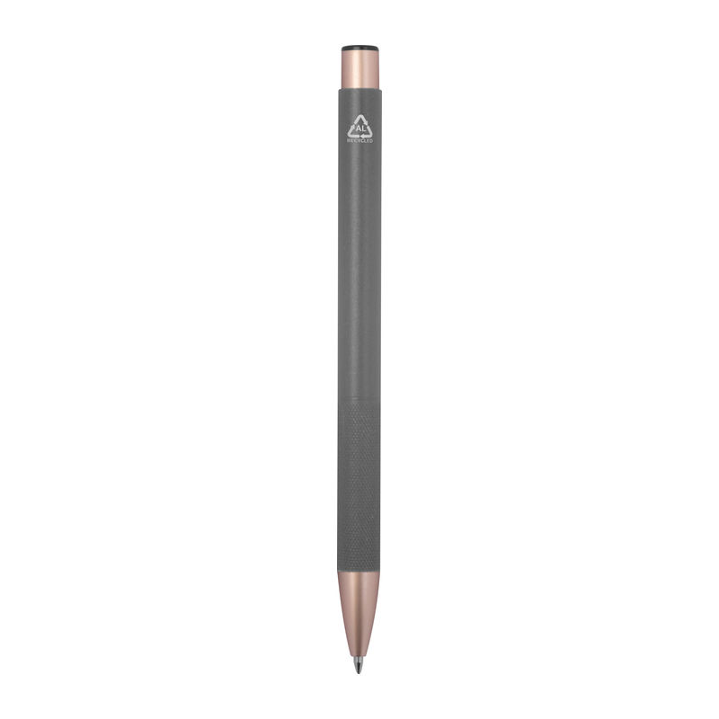 Ballpoint pen made of recycled aluminum with a matte finish and rose gold accents, equipped with a blue-writing large-capacity refill and a diamond-patterned grip zone. Your logo will be engraved to the right of the clip.