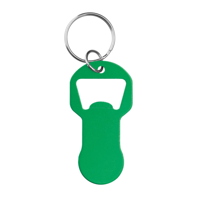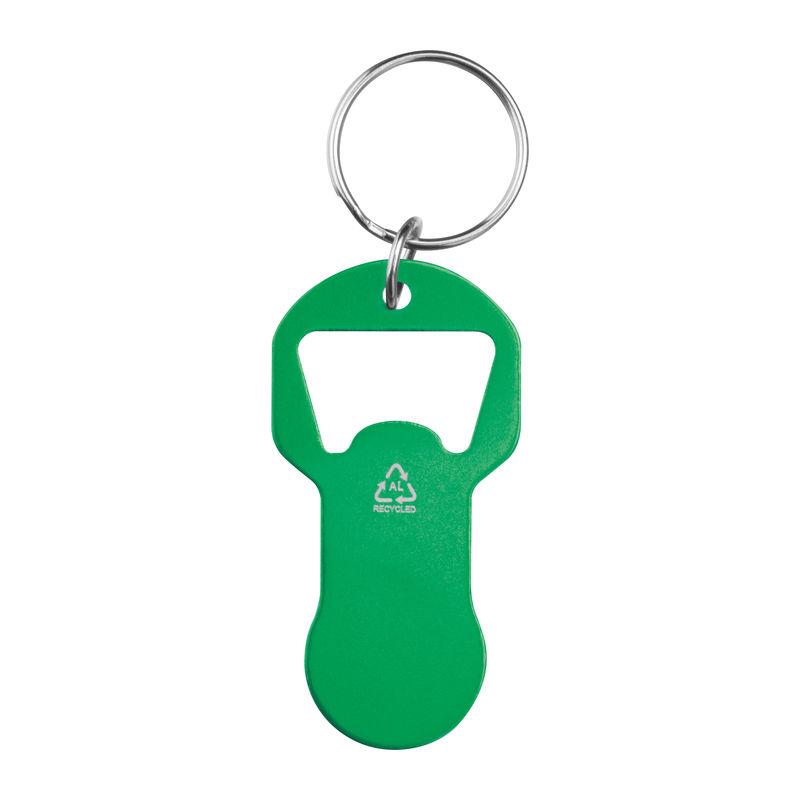 Keychain made of recycled aluminum with integrated bottle opener and shopping cart token. Lightweight, practical, and ideal for everyday use.