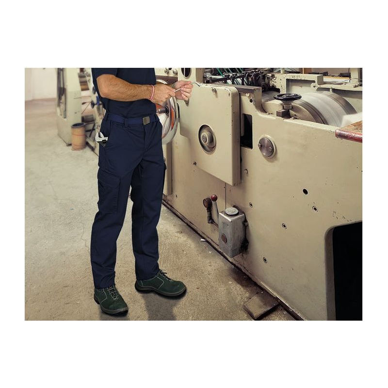 Trousers 65% polyester, 35% cotton. 240 grs/m² twill fabric. 1 cargo pocket on left leg. 1 cargo pocket + cutter knife pocket on right leg. 2 back flap pockets. 2 waist pockets. Elastic waist. Reinforced seams. 20 units per box: 1 size, 1 color. Individual bag.