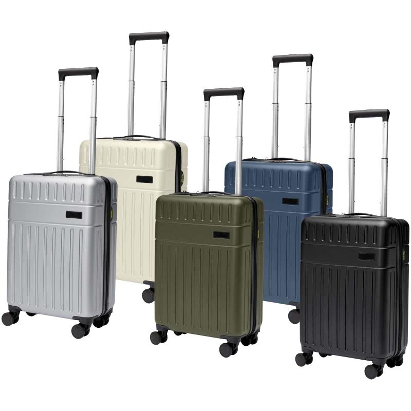 Constructed with impact-resistant recycled plastic and RPET lining, the 20” Rover cabin trolley stands for quality. It features a double-tube aluminium frame, 360 degree 4-wheel spinner, an integrated TSA combination lock, an easy grab handle for comfort, and interior divider organiser compartments. Can be brought as hand luggage on most mainstream airlines. This trolley is GRS certified, including the printing, making it a more responsible choice.