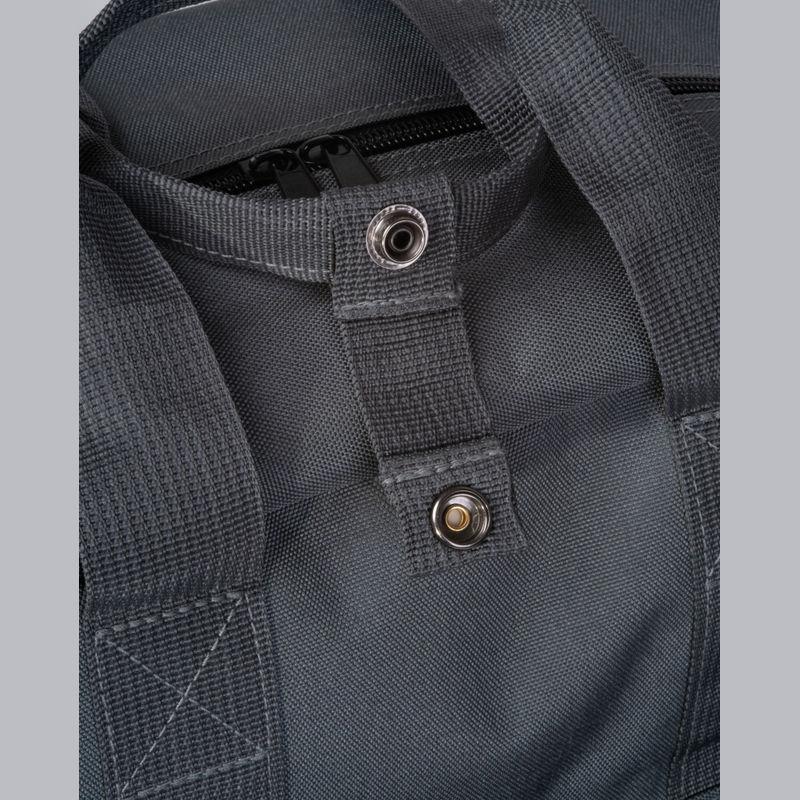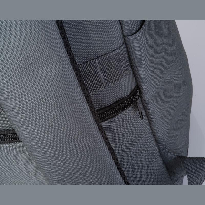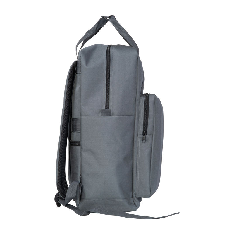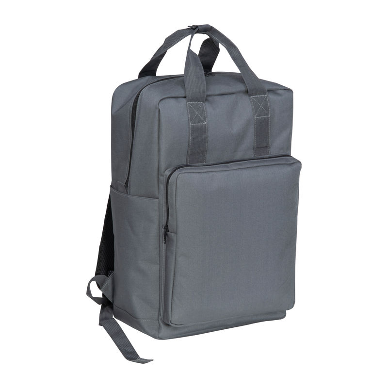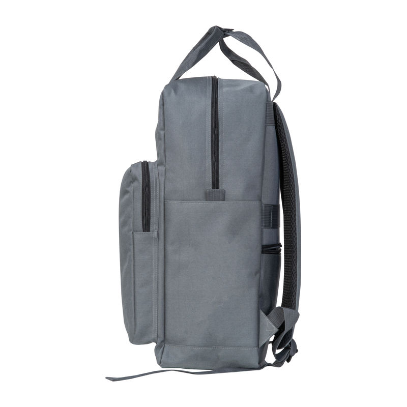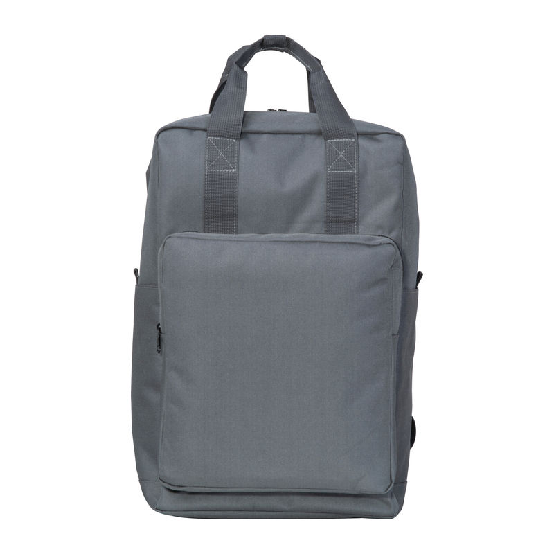 Backpack made of RPET with side pockets, padded shoulder straps, front pocket, laptop compartment, trolley and anti-theft function, as well as lockable snap buttons.