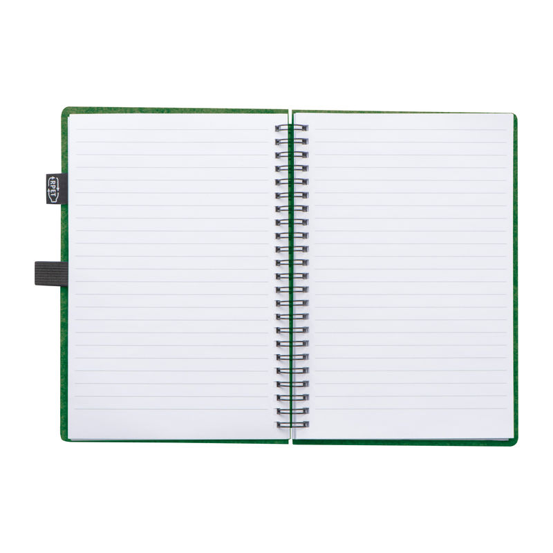 Notebook made of RPET felt and 160 lined pages of recycled paper with spiral binding and ballpen loop, with RPET label.