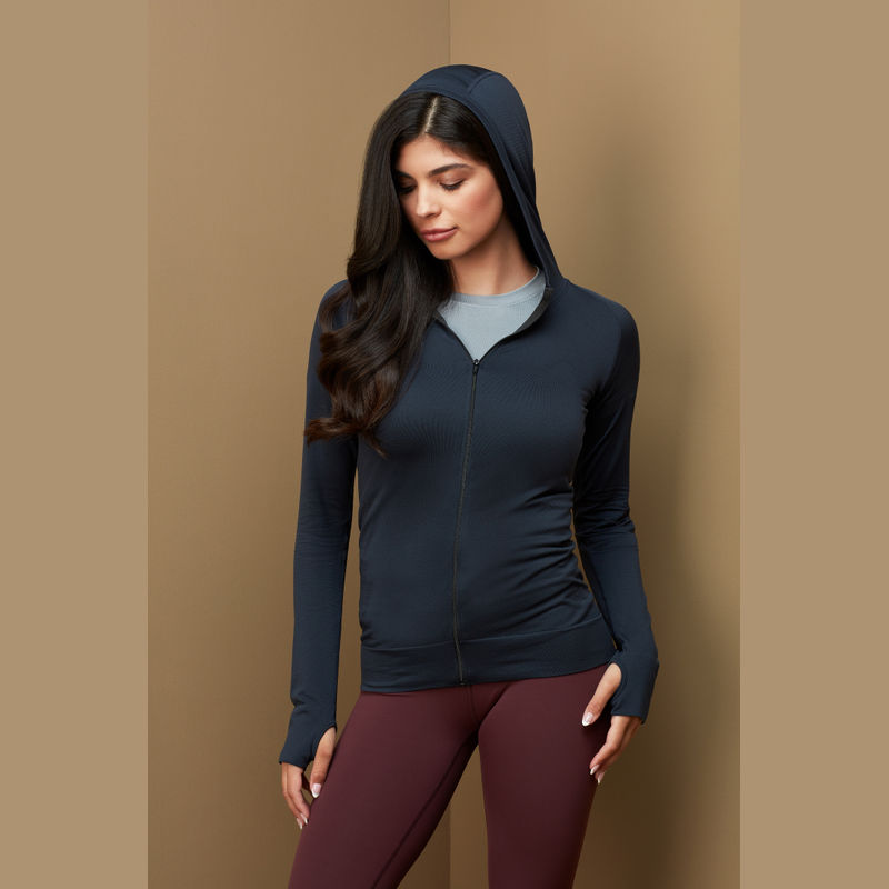 Seamless sports jacket for ultimate comfort without itchy side-seams, equipped with a 3-piece-hood, a high-quality sbs zipper, a zipper garage and thumb holes in the sleeve cuff