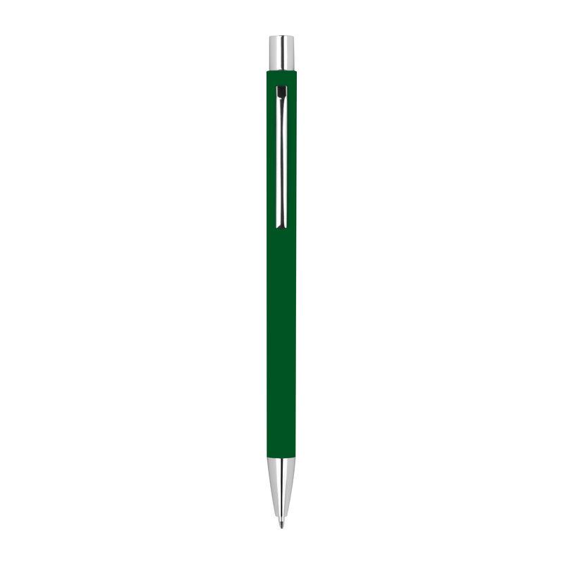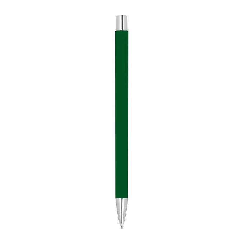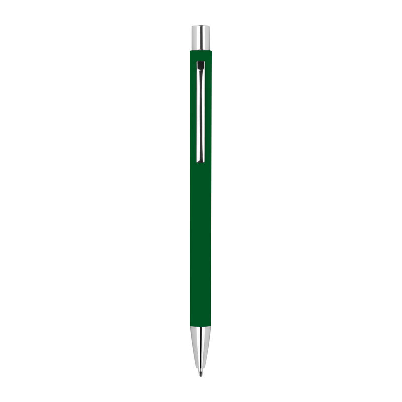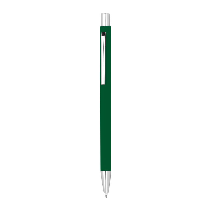 Slim metal retractable ball pen with silver applications and blue-writing refill. Your logo willl be engraved to the right of the clip.