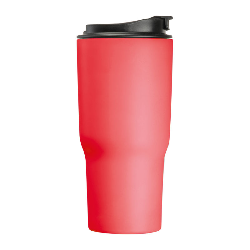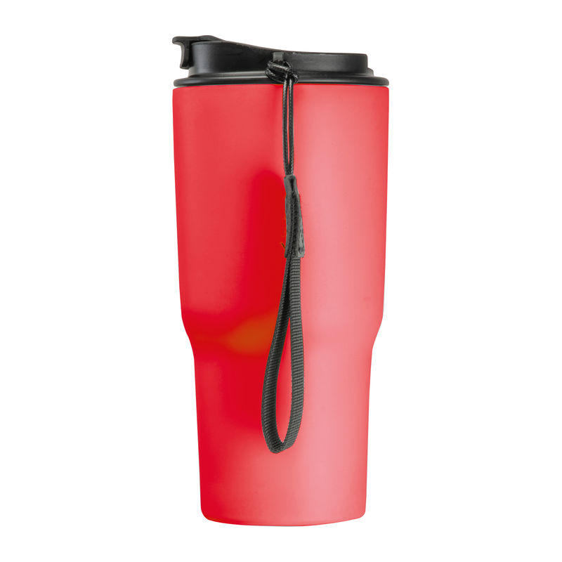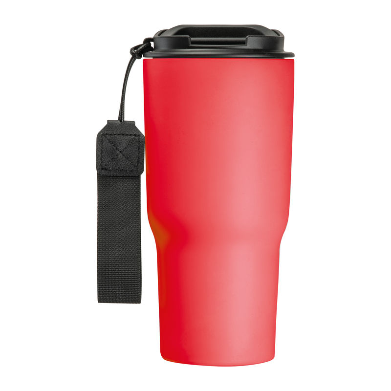 Elegant double-walled vacuum drinking cup made of stainless steel with a capacity of 550ml, a leak-proof screw cap and drinking opening as well as a practical carrying strap. We engrave your logo on the mug.