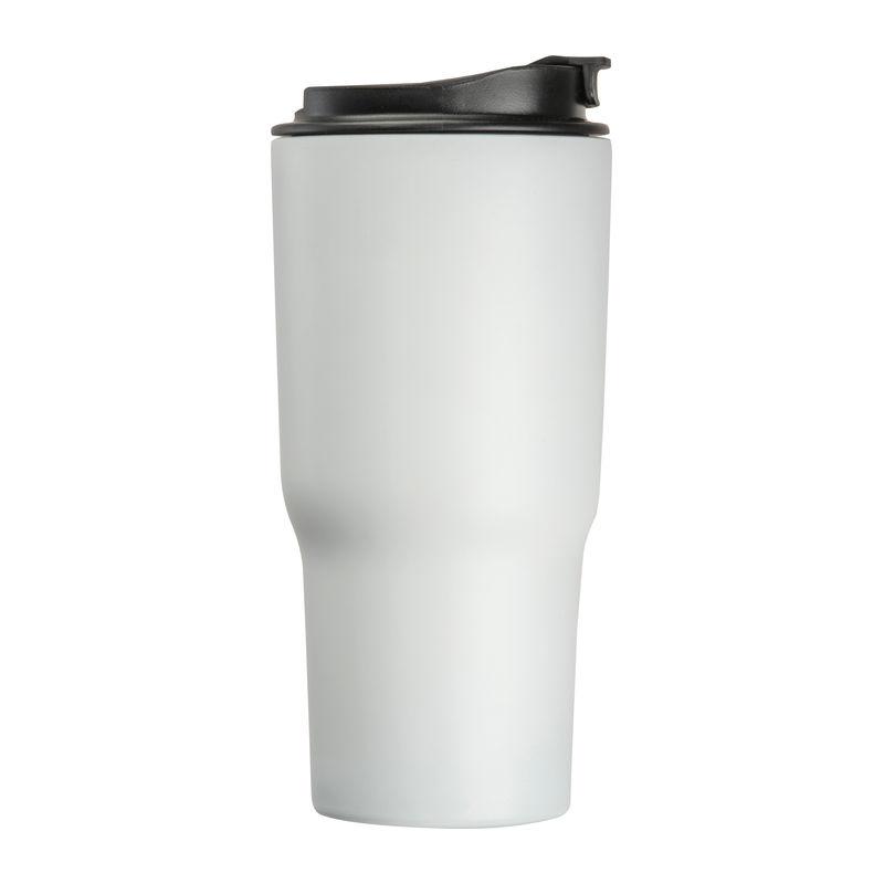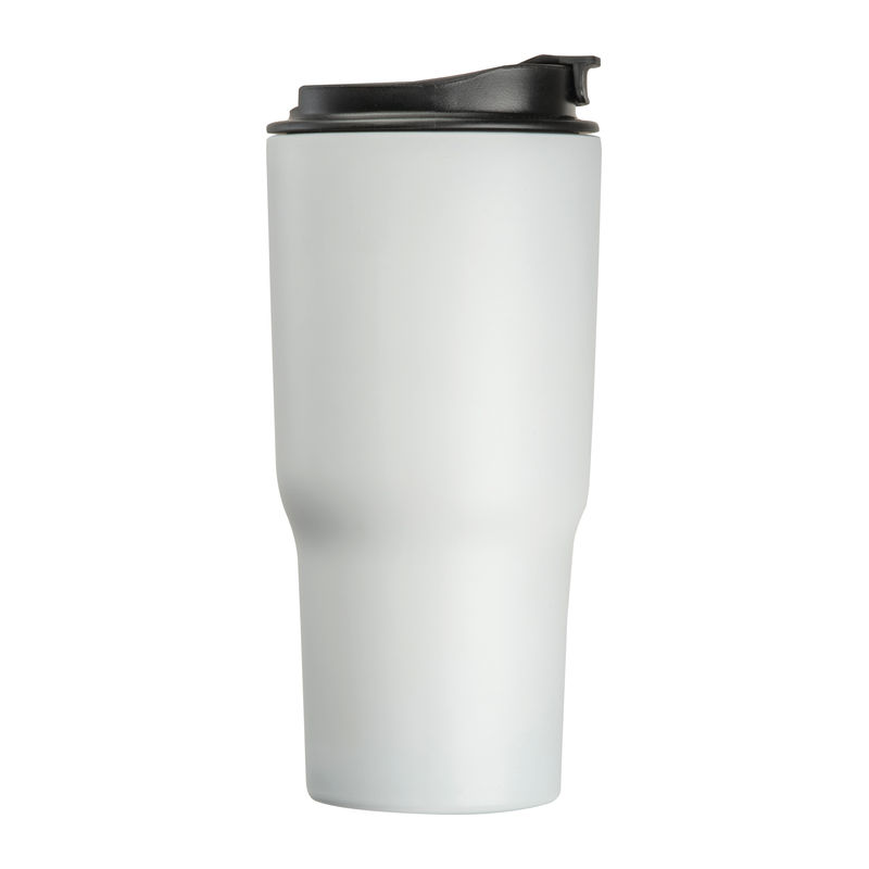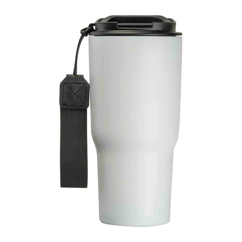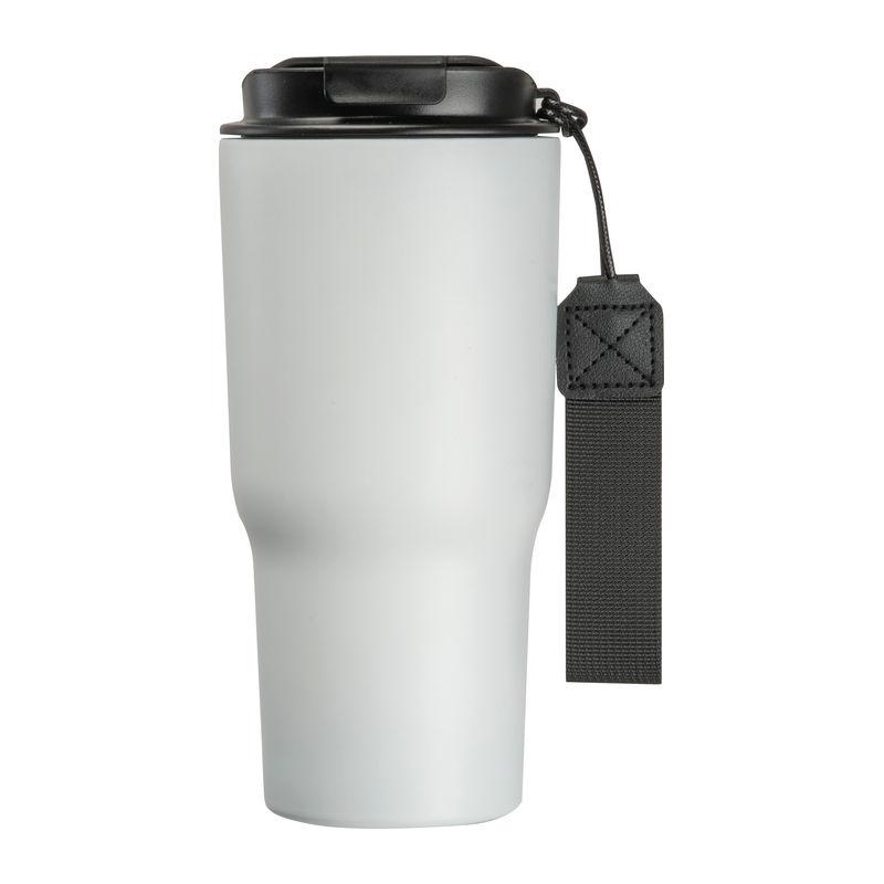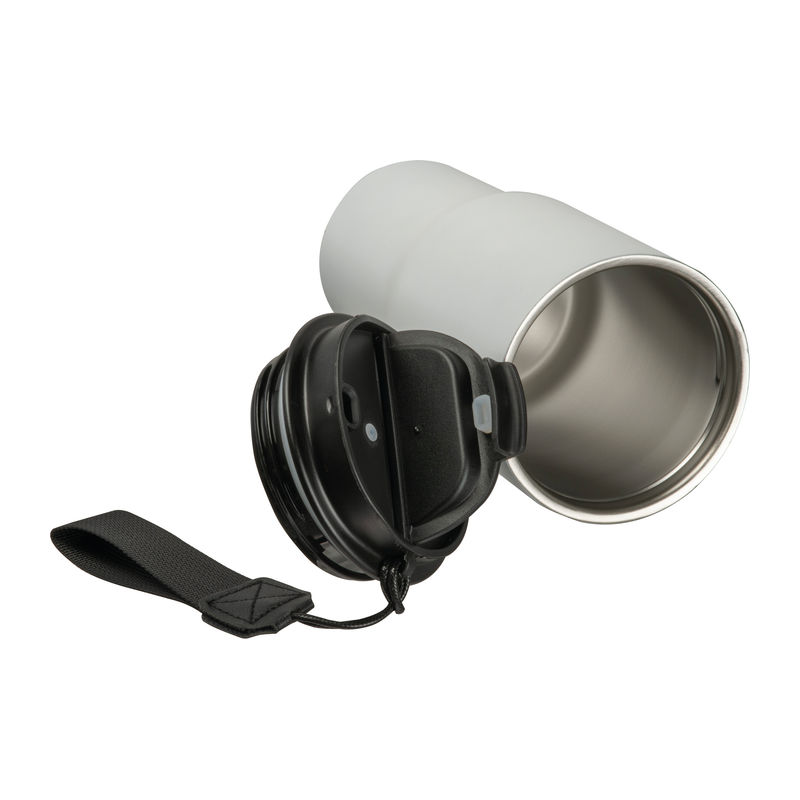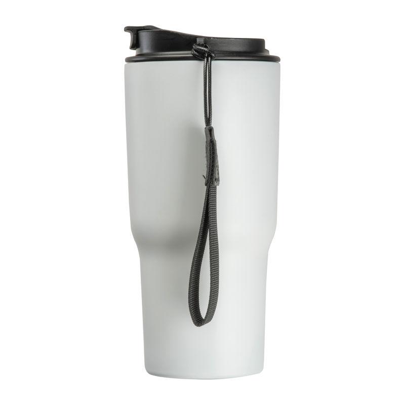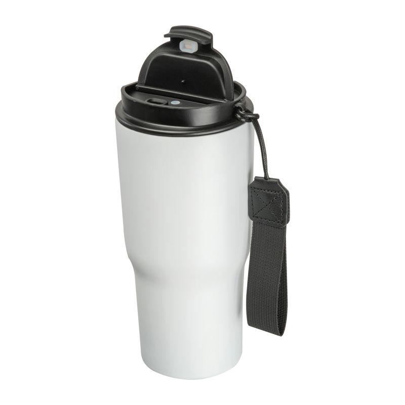 Elegant double-walled vacuum drinking cup made of stainless steel with a capacity of 550ml, a leak-proof screw cap and drinking opening as well as a practical carrying strap. We will engrave your logo on the mug.