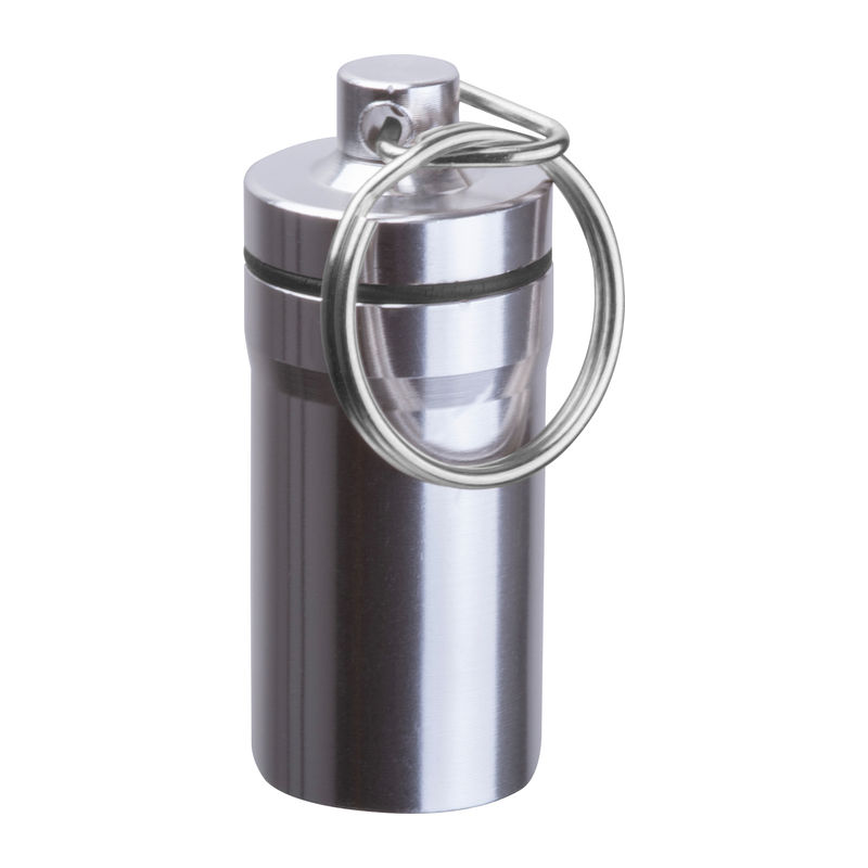 Keychain container with a stainless steel exterior and plastic interior. Ideal for safely storing small items while on the go.
