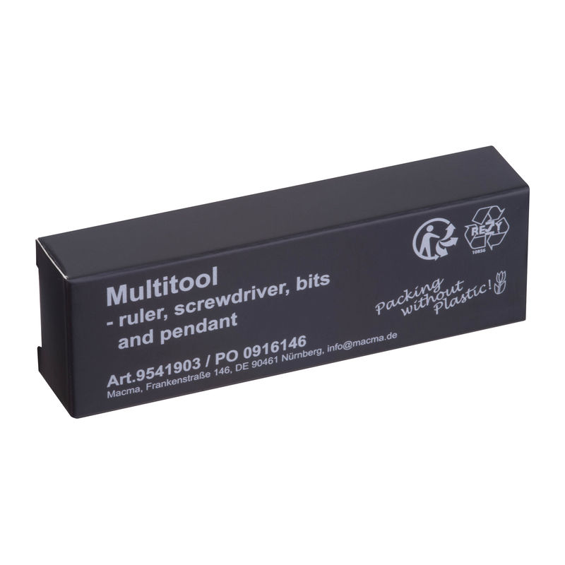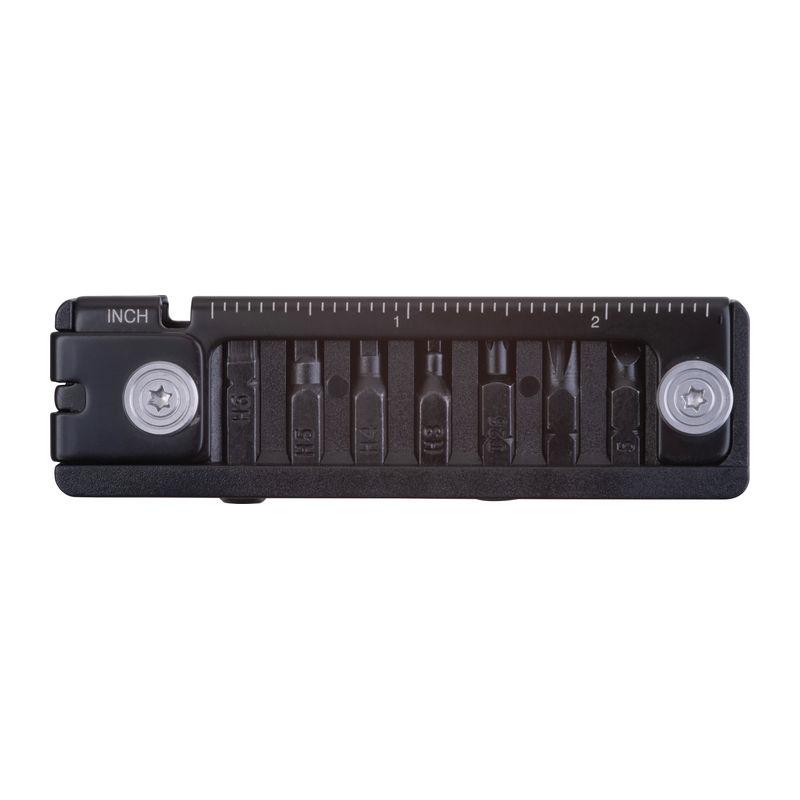 Stainless steel 8-piece multitool with hex keys H3/H4/H5/H6, T25, Phillips PH2, flathead screwdriver, and integrated ruler. Compact and versatile.