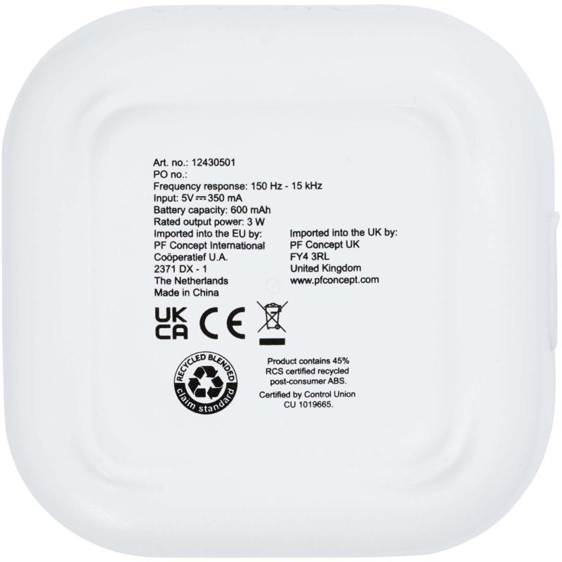 RCS recycled 3W Bluetooth® speaker that plays music, podcasts etc. from any Bluetooth® enabled device, making it an ideal companion for any occasion. The speaker features built-in music controls and a microphone for phone calls and online meetings. Enjoy up to 3-4 hours of music at maximum volume. The charging time is 3 hours. Bluetooth® 5.3 with a working range of approximately 10 metres. Delivered with a user manual and a 30 cm USB-A to Type-C charging cable, and packed in a 100% recycled cardboard box from sustainable sources.