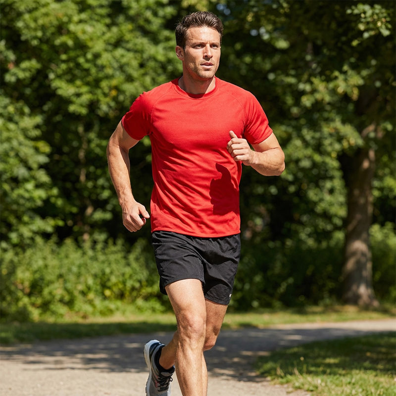 140 g/m² 100% textured polyester men's sport t-shirt. Crew neck comfort finish. Short raglan sleeves, anti chafe flat locked seams. Ultra tech moisture wicking action, contoured, drop back hem.