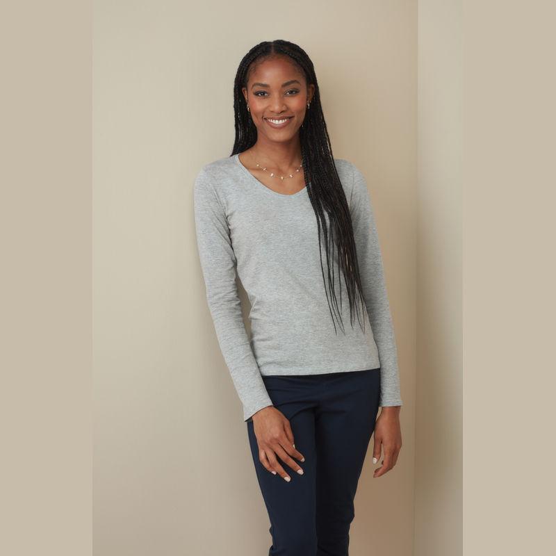 Fitted long sleeve T-shirt for women, with fashionable length made of a soft and sleek cotton-elastane-blend with wide V-neck drop and contrast neck tape.