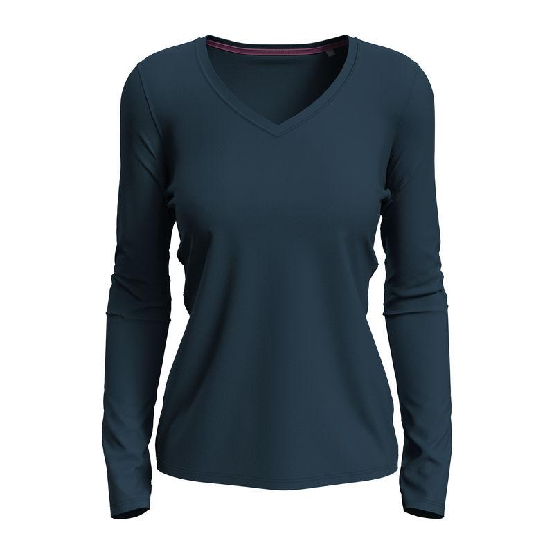 Fitted long sleeve T-shirt for women, with fashionable length made of a soft and sleek cotton-elastane-blend with wide V-neck drop and contrast neck tape.