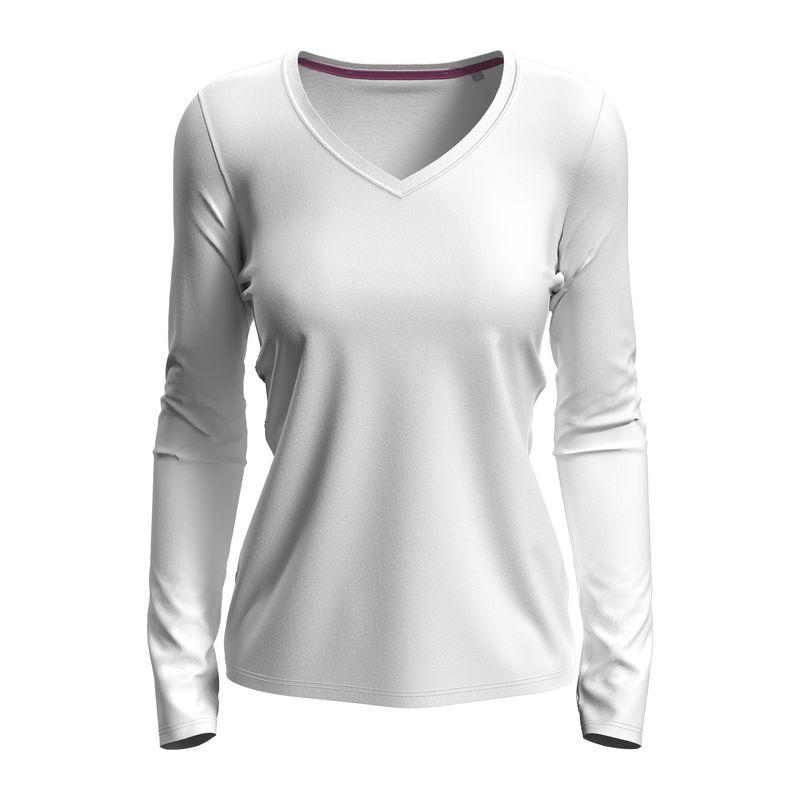 Fitted long sleeve T-shirt for women, with fashionable length made of a soft and sleek cotton-elastane-blend with wide V-neck drop and contrast neck tape.