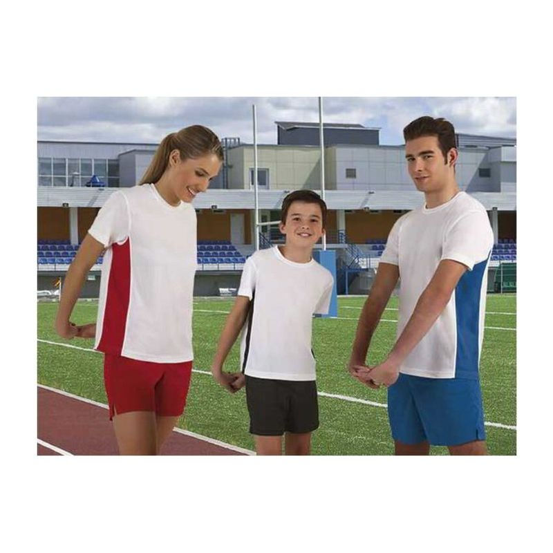 100% polyester. 145 grs/m2 breathable technical fabric. Round neck. Lateral bands in color. Double stitchingon neck, bottom and sleeves. 100 units per box. 10 units per package: 1 size, 1 color.
