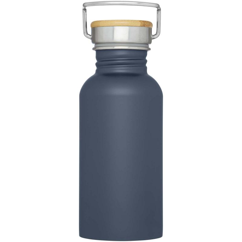 Single-walled stainless steel bottle with screw-on lid. The lid features a bamboo top, as well as a handle for easy carrying. Volume capacity is 550 ml. Presented in an Avenue gift box.