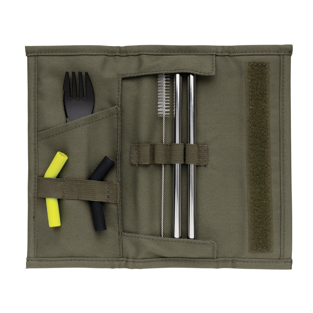 The Tierra 2 pc straw and cutlery set is the ideal set to take with you on the go when you want to reduce the use of single-use plastic. The set contains 2 stainless steel straws, a cleaning brush, a spork and 2 bent silicone straw pieces to attach to the straight ss straw for optimal comfort while sipping your drink. The 2 different colours make it easy for you to tell them apart. Packed in a convenient pouch with Velcro closure. Dishwasher safe. Exterior 100% 600D polyester, interior 100% 210D polyester. PVC free.