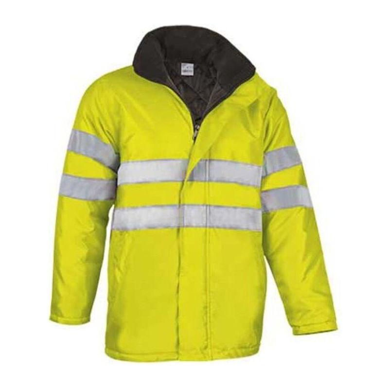 Outside waterproof fabric with polyurethane coating. Padded inside with lining 200 grs/m². Sewn retroreflective bands around the body and arms. Central closure with double zip. Central placket with snap fasteners. Fleece-lined collar (more confortable). 2 lower pockets. Inside zip pocket. Hood with adjustable drawstring hidden in neckband. Inside cuffs sleeves (more ergonomic). 10 units per box: 1 size, 1 color. Individual bag.