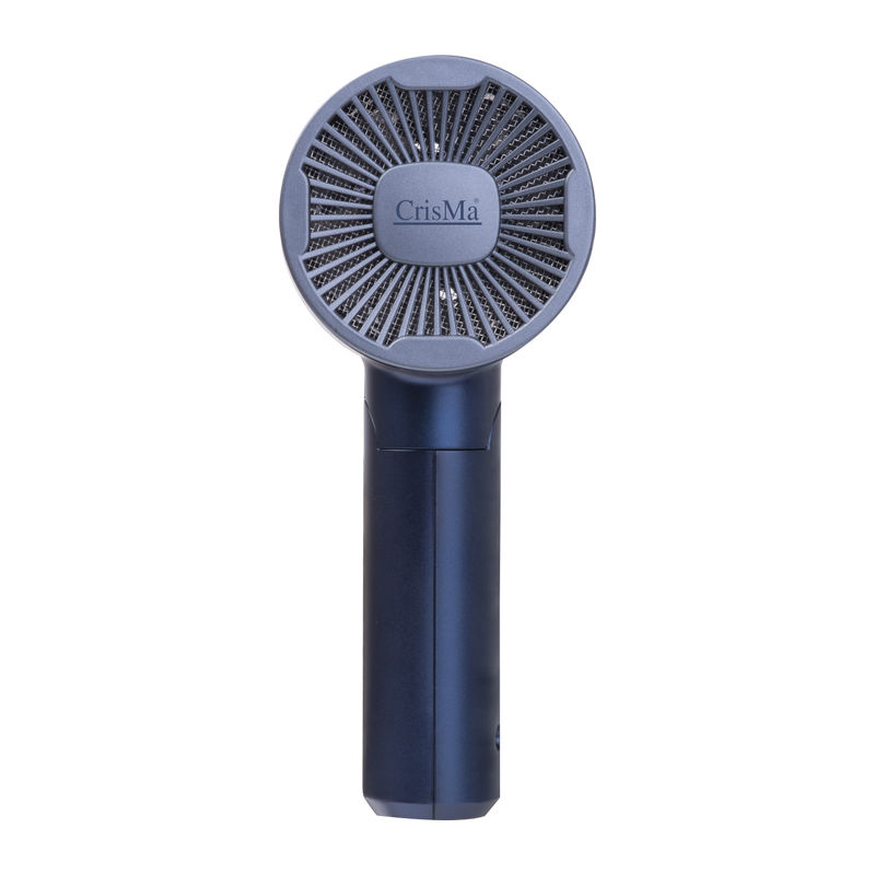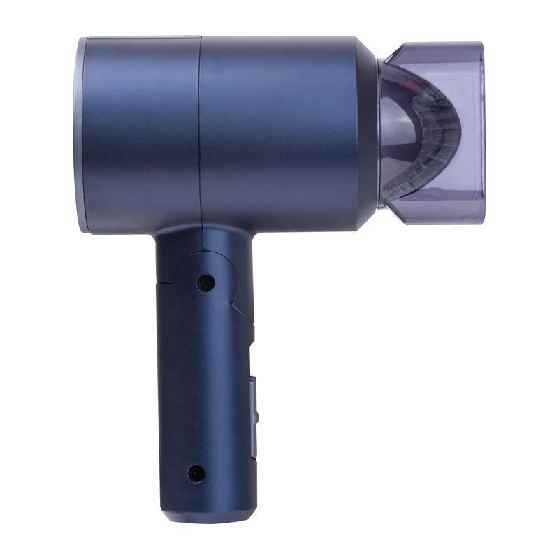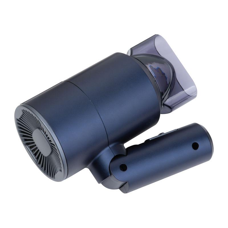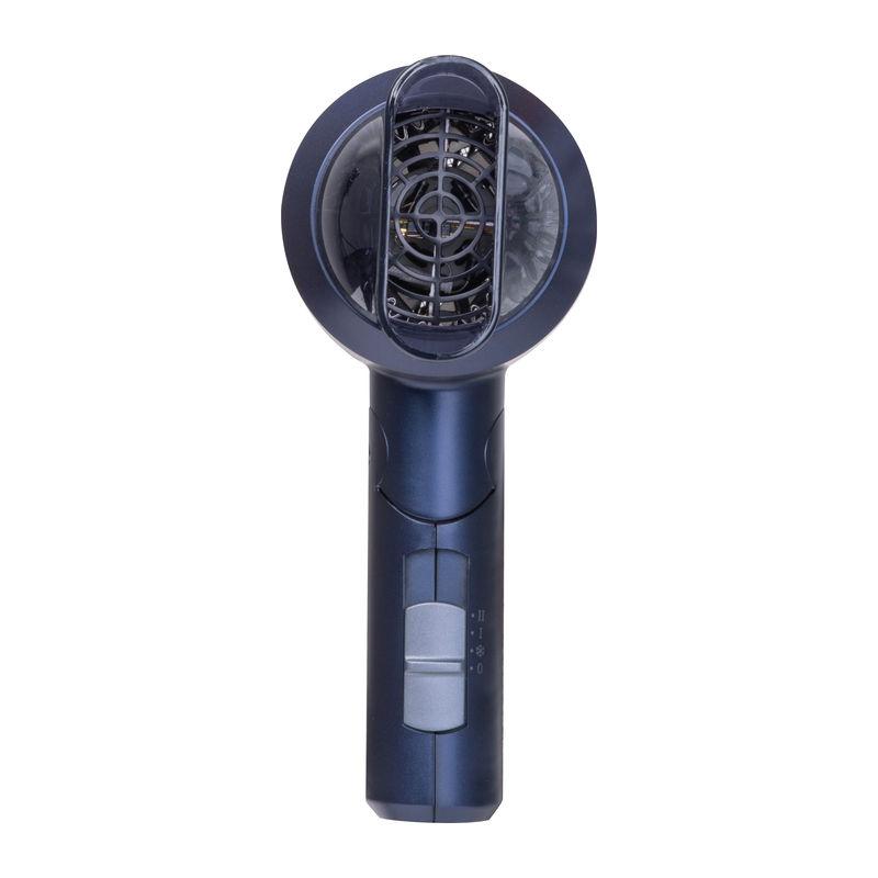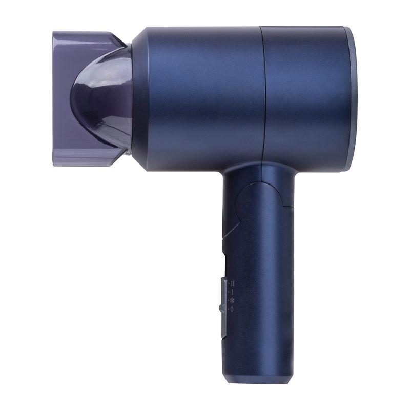 Compact metallic blue travel hairdryer with 1100 watts and 3 temperature settings (cold & 2 heat levels).