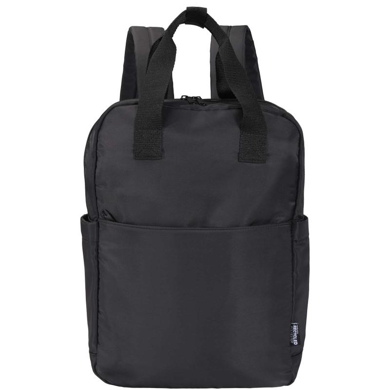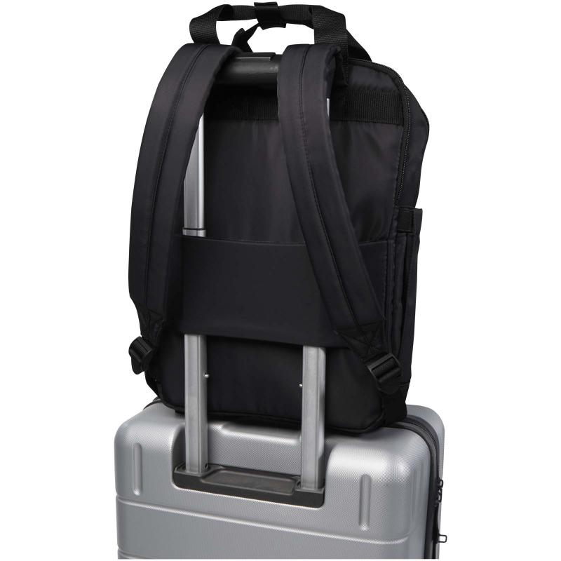 The Trip Aware™ recycled travel laptop backpack is a compact, lightweight backpack designed for streamlined travel and everyday use. Made from durable 290D twill polyester with a soft knitted backing and lined with RPET 210D/PU, it combines functionality with a clean, practical design. It features two side pockets for water bottles, dual carry handles, and comfortable shoulder straps. The front zip pocket includes organised storage for a passport, pens, and a ribbon for keys, while the main compartment fits a notebook or tablet. A separate 14” laptop compartment and a trolley sleeve on the back make it especially suitable for travel. Each bag also comes with an Aware™ tracer. This innovative feature allows users to trace the origins and journey of their item through a QR code, enhancing transparency in the supply chain and fostering a stronger connection between the product and its production process. Volume capacity: 9 litres.